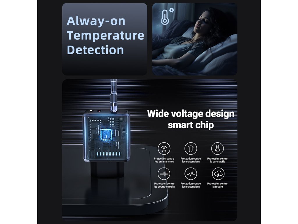 - Vyrobeno z odolného samozhášecího plastu, zásuvková nabíječka Type-C zajišťuje ochranu proti přehřátí a zkratu.