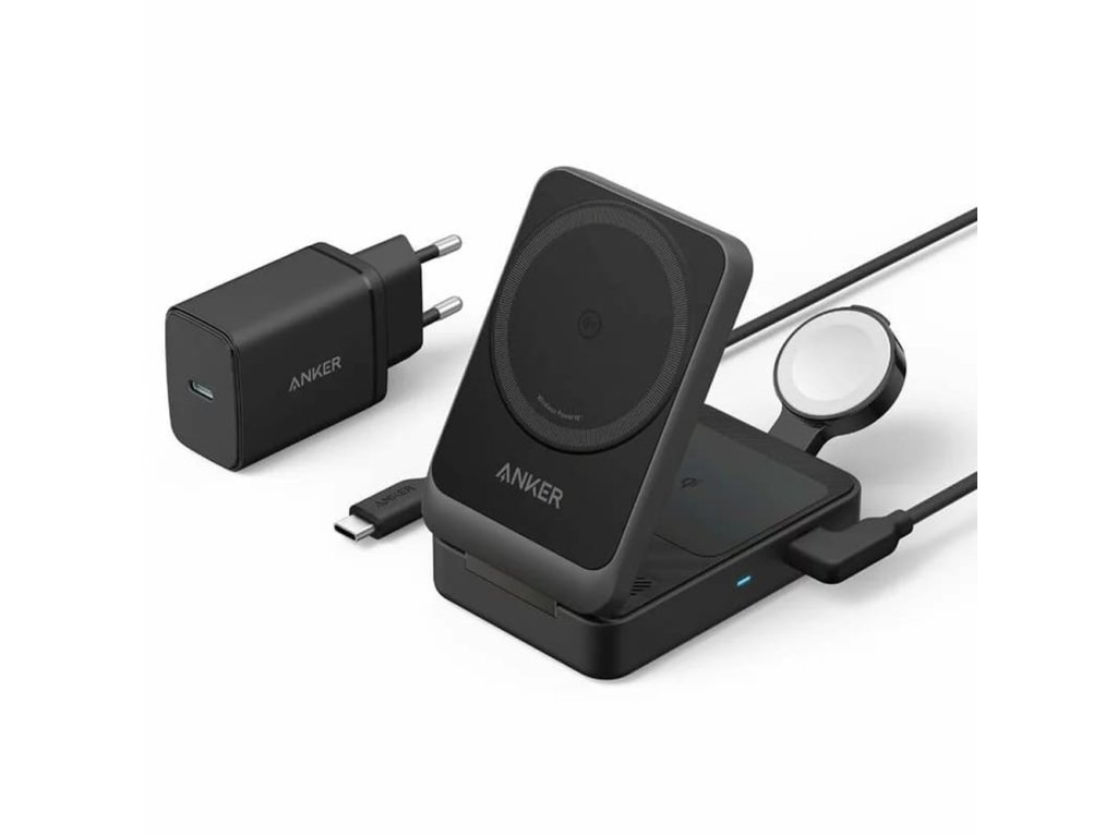 Balení obsahuje: bezdrátovou nabíječku Anker MagGo 3-in-1, nabíječku, USB-C kabel.