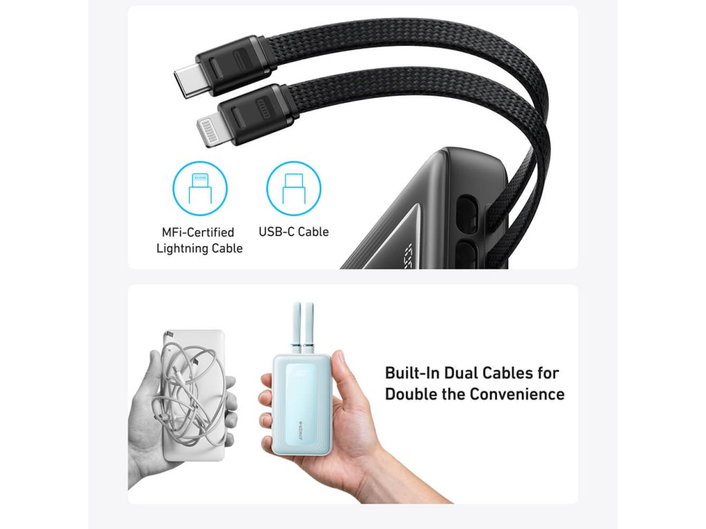 Protože má zabudované 2 nabíjecí kabely. Proto není nutné brát s sebou další příslušenství. My jsme mysleli na všechny aspekty. Vy musíte jen nyní zakoupit tuto prémiovou power banku Type-C.