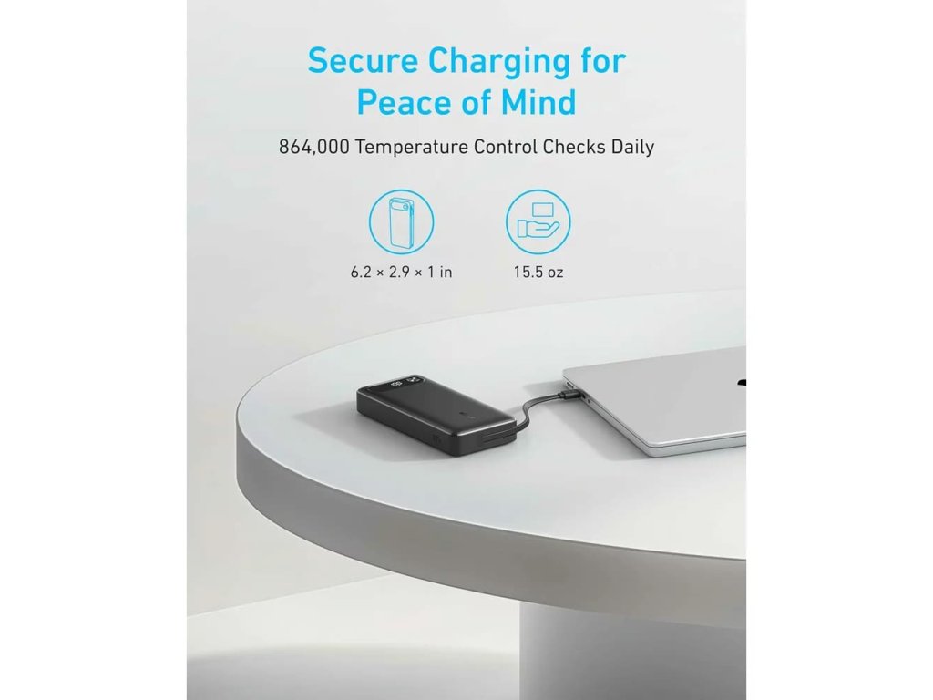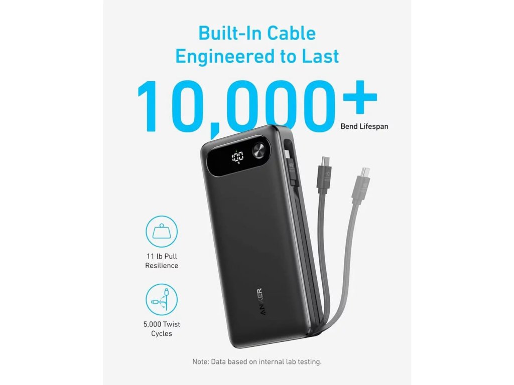 - Díky integrovanému kabelu dosáhne úroveň baterie smartphonu iPhone 15 Pro 58 % nebo laptopu MacBook Air 52 % za pouhých 30 minut.