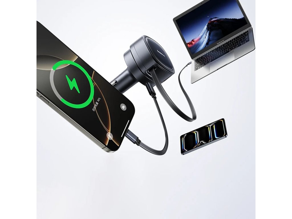 Nabíječka do auta poskytuje až 60W prostřednictvím portů USB a Type-C, umožňující napájení tří zařízení současně bez ztráty výkonu.