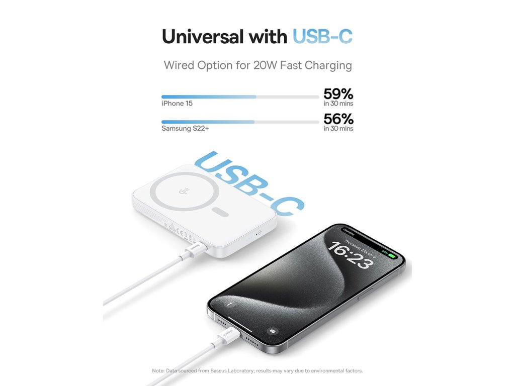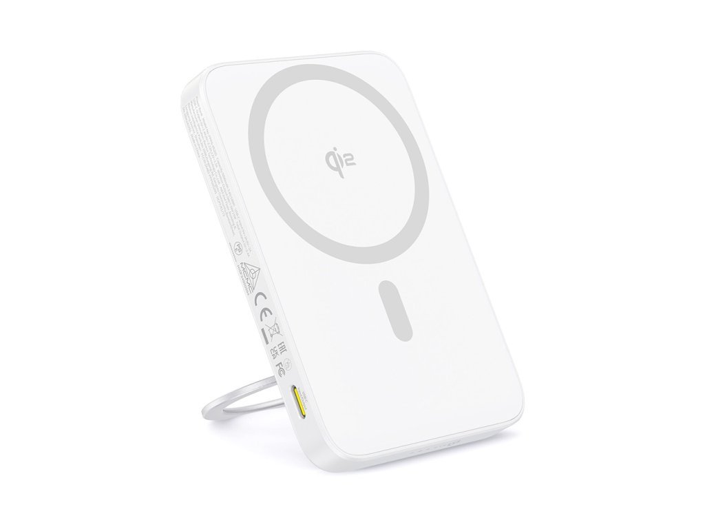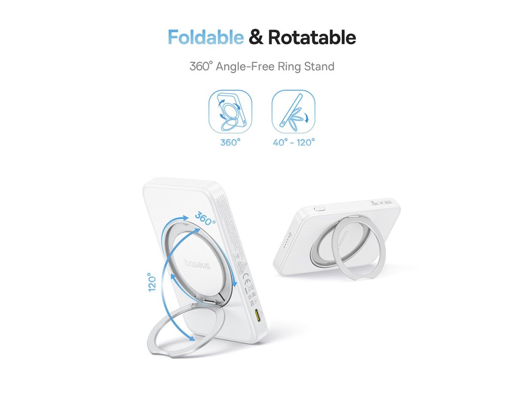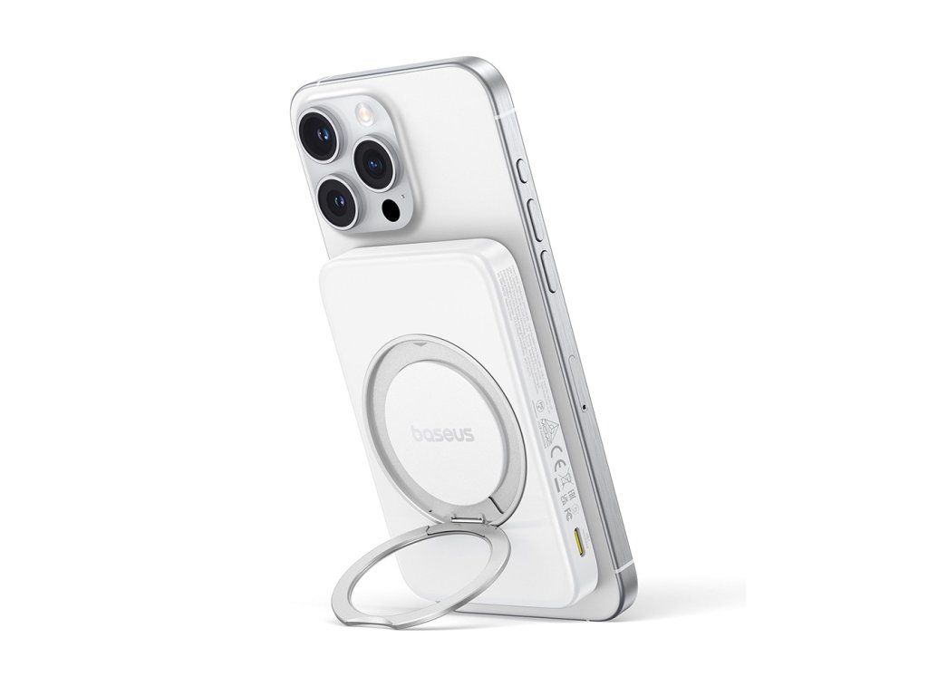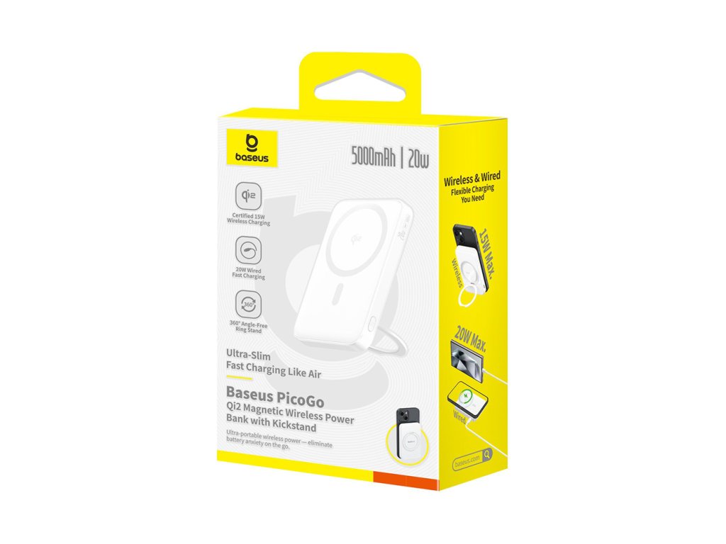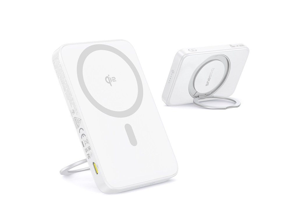 Baseus - PicoGo - powerbanka, USB-C, Qi2, 20 W, 5000 mAh, otočný stojan, kabel USB-C - bílá
