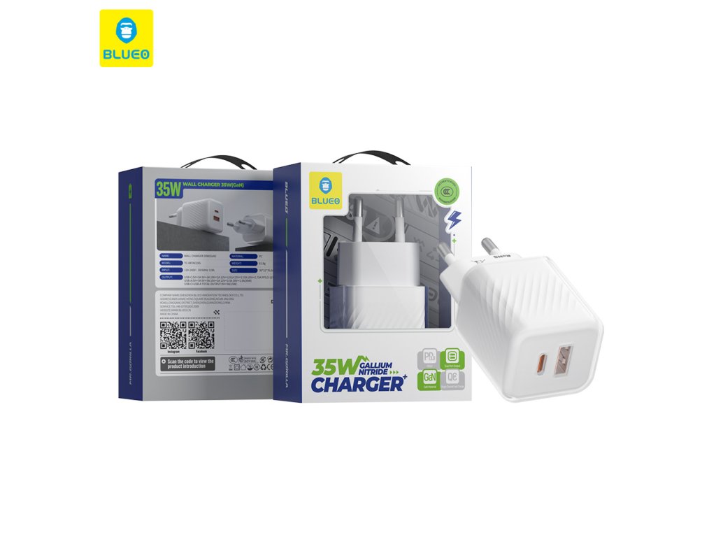 Blueo - Wall Charger Dual Port síťová nabíječka (1× USB, 1× USB-C, GaN technologie, rychlonabíjení, elegantní povrch, PD3.0, 35W) - bílá