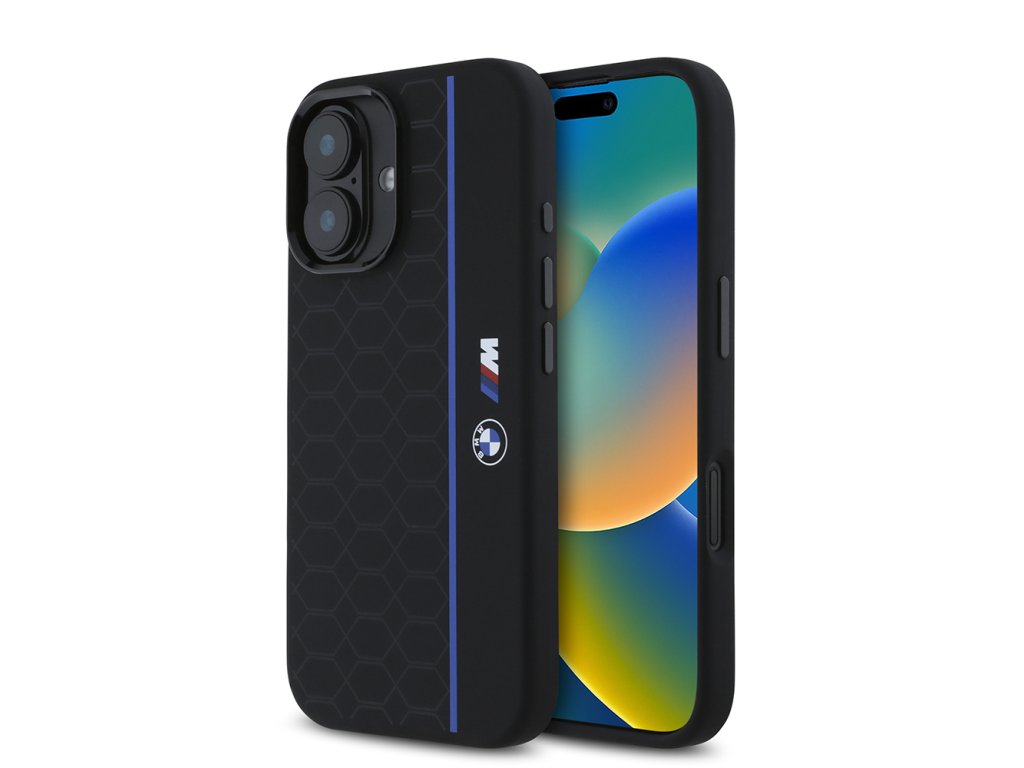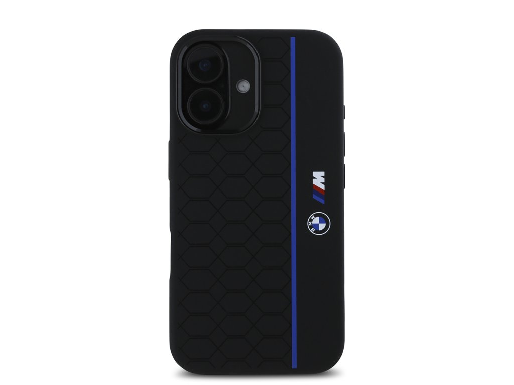BMW MagSafe silikonový kryt M s hexagonální modrou linií pro iPhone 16 – Černý