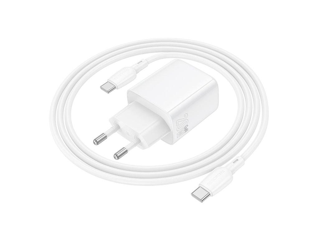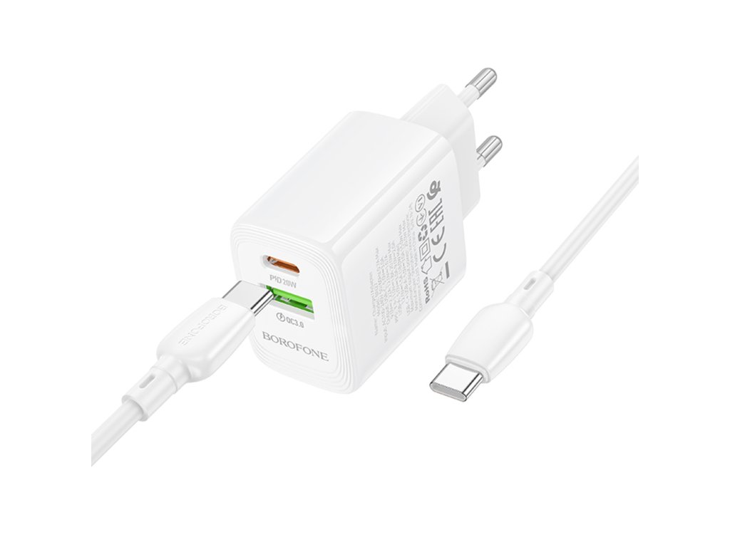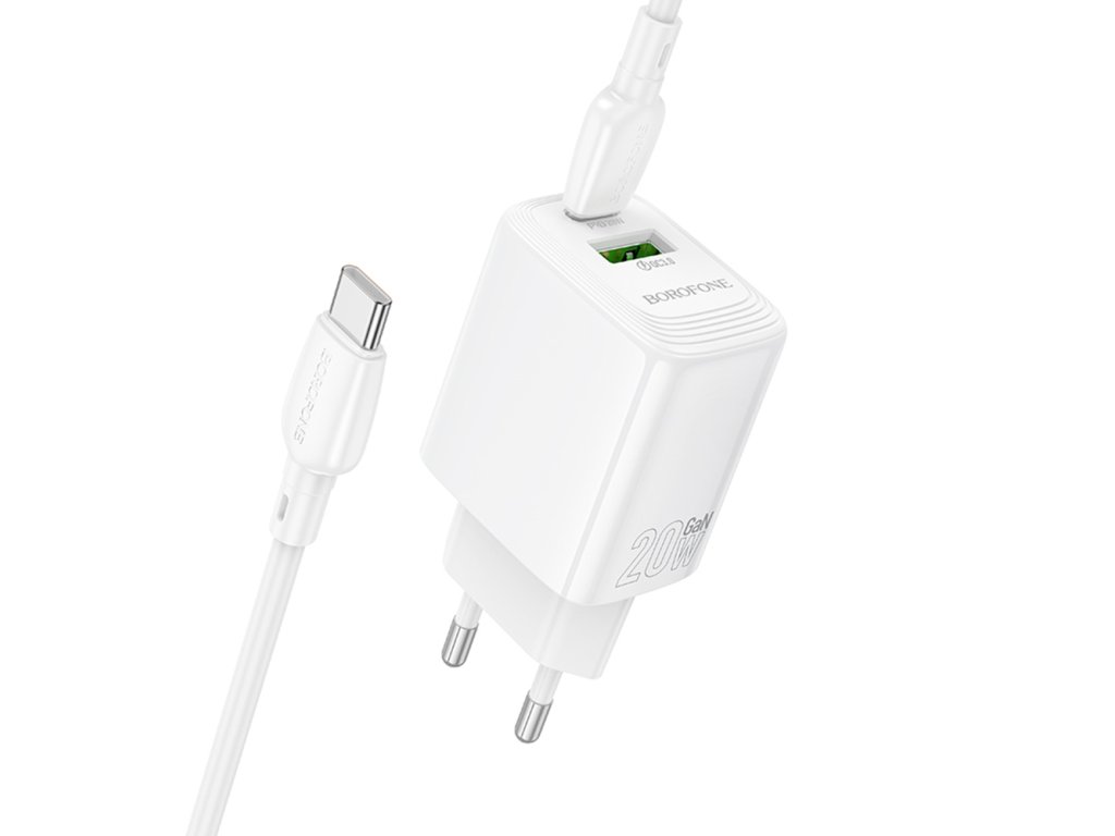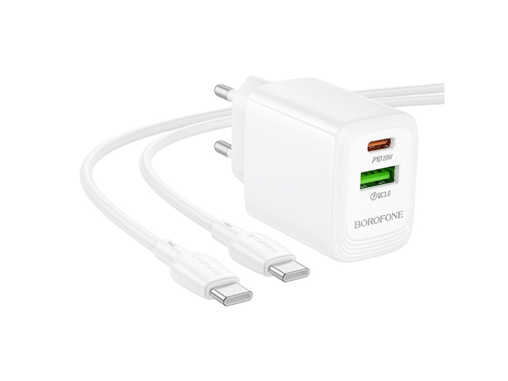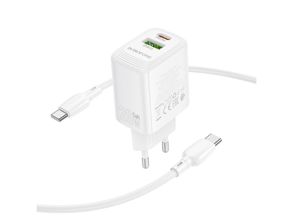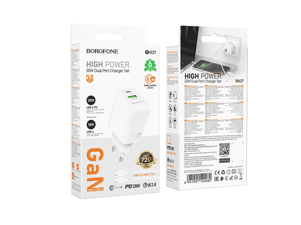 Borofone - Wall Charger Fuente BN27 síťová nabíječka (USB-C kabel v balení, USB + USB-C, PD20W, QC3.0, GaN technologie) - bílá