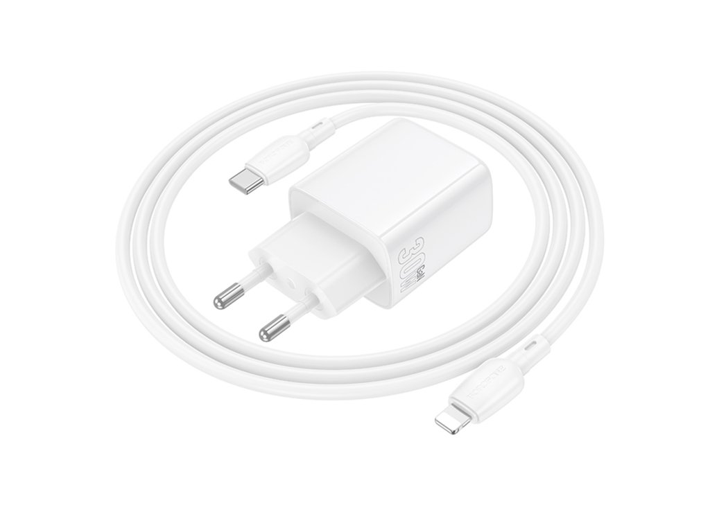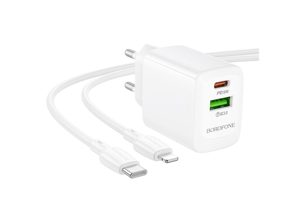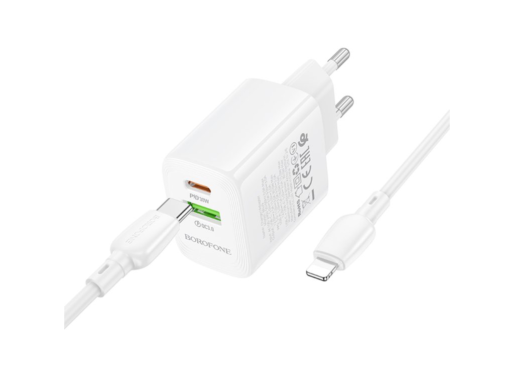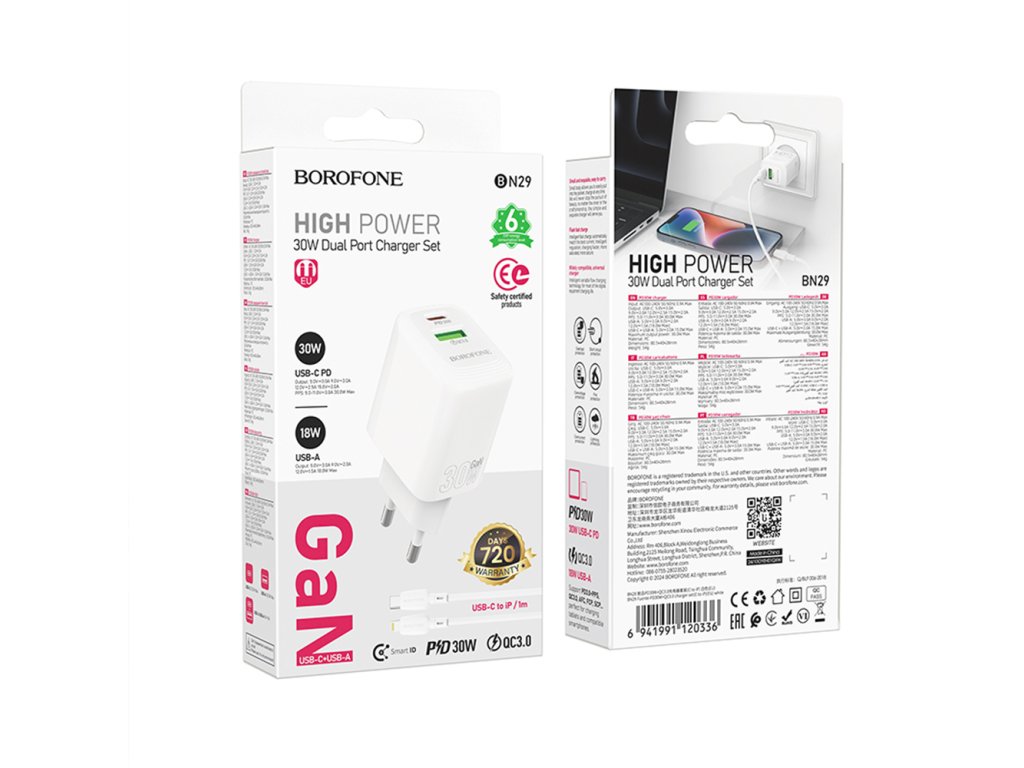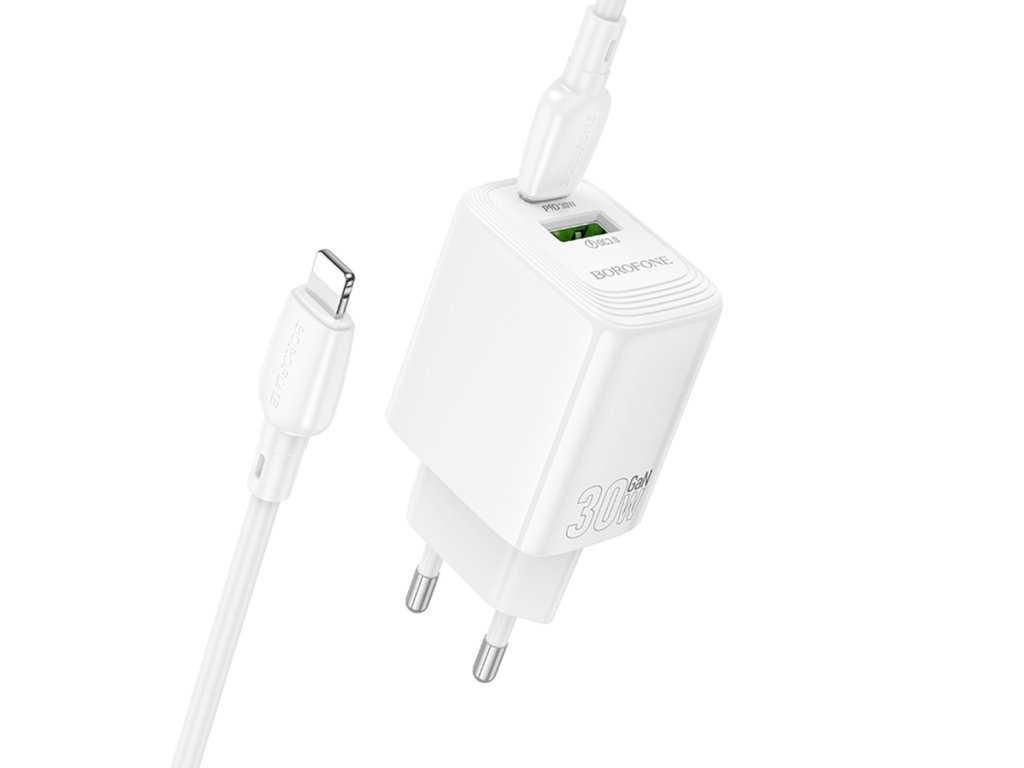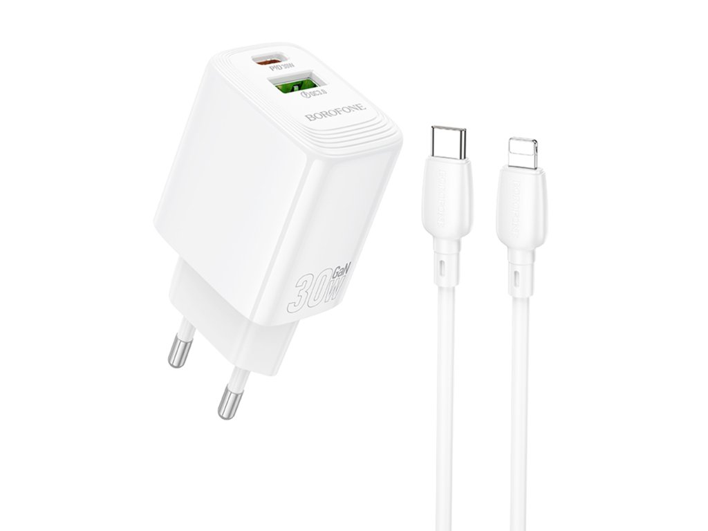 Borofone - Wall Charger Fuente BN29 síťová nabíječka (USB-C – Lightning kabel v balení, USB + USB-C, PD30W, QC3.0, GaN technologie) - bílá