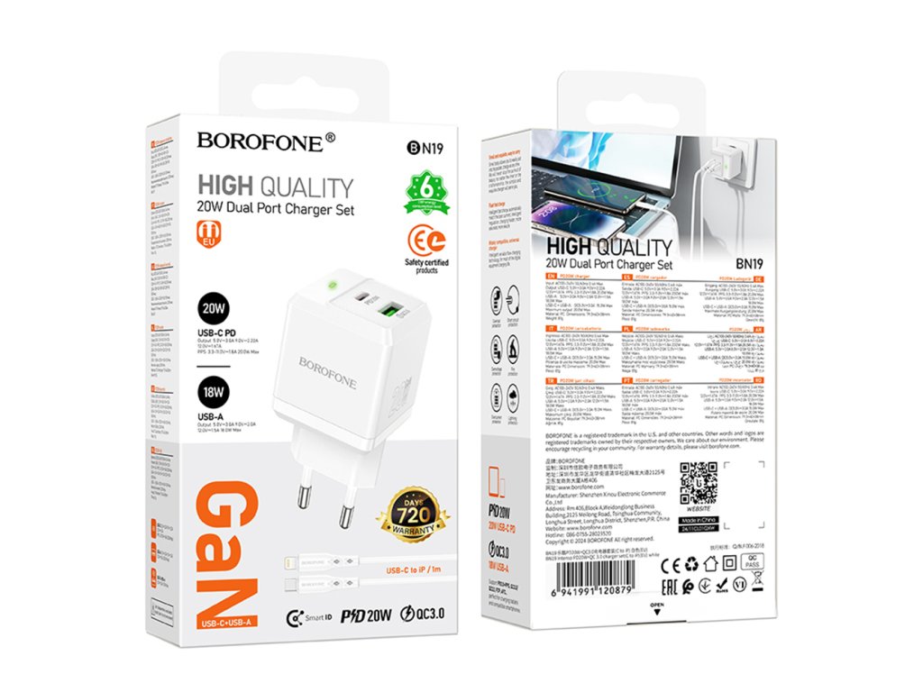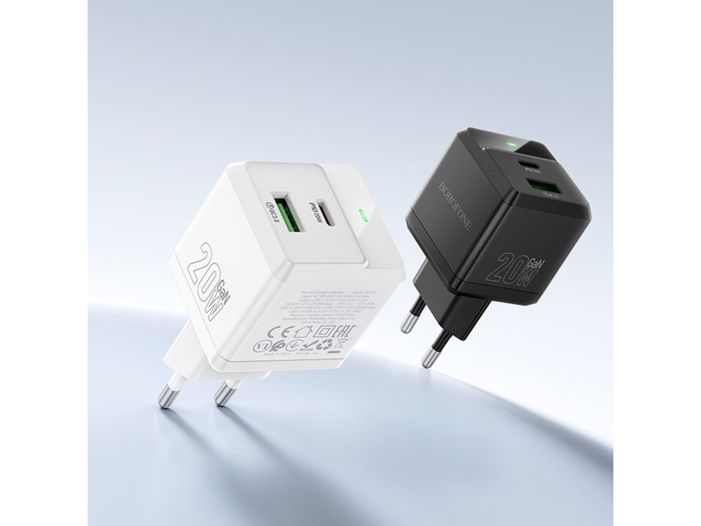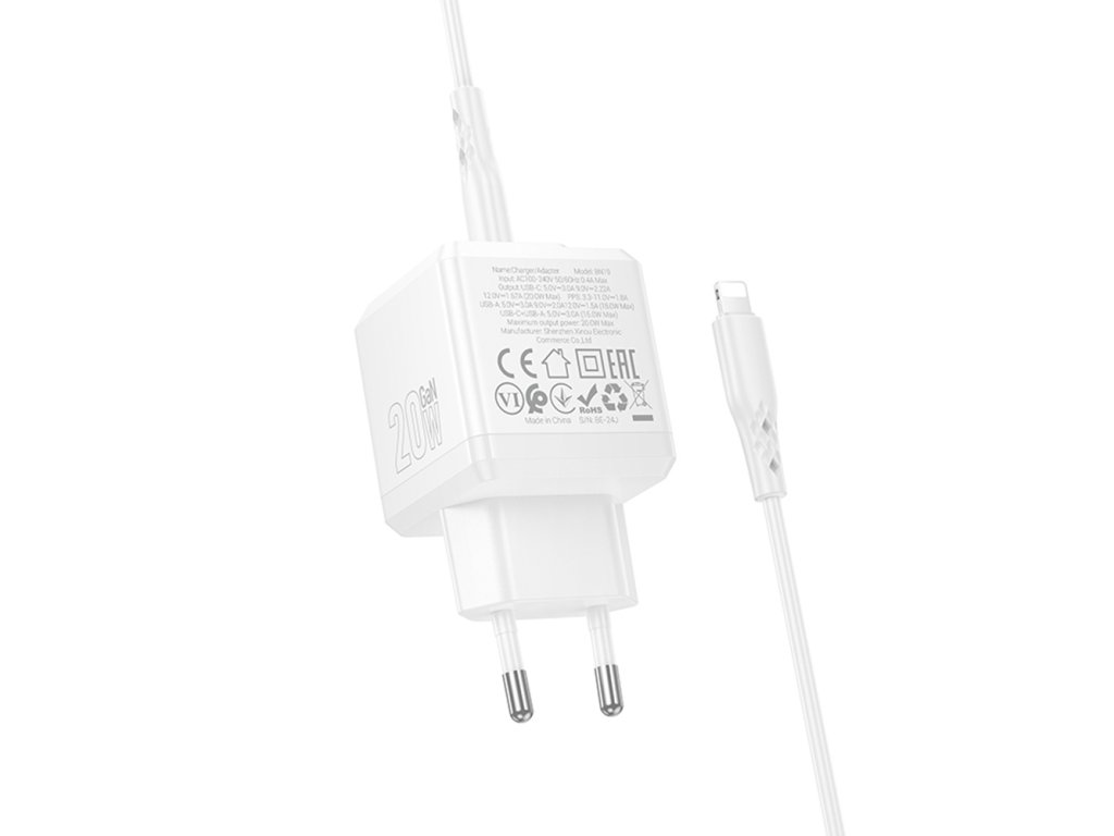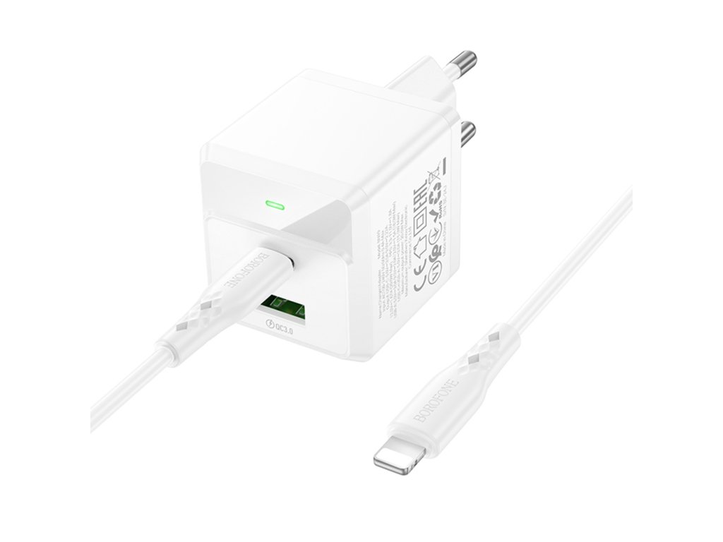 Borofone - Wall Charger Intenso BN19 síťová nabíječka (USB-C – Lightning kabel v balení, dual port, USB+USB-C, PD20W, QC3.0, 5V/3A) - bílá