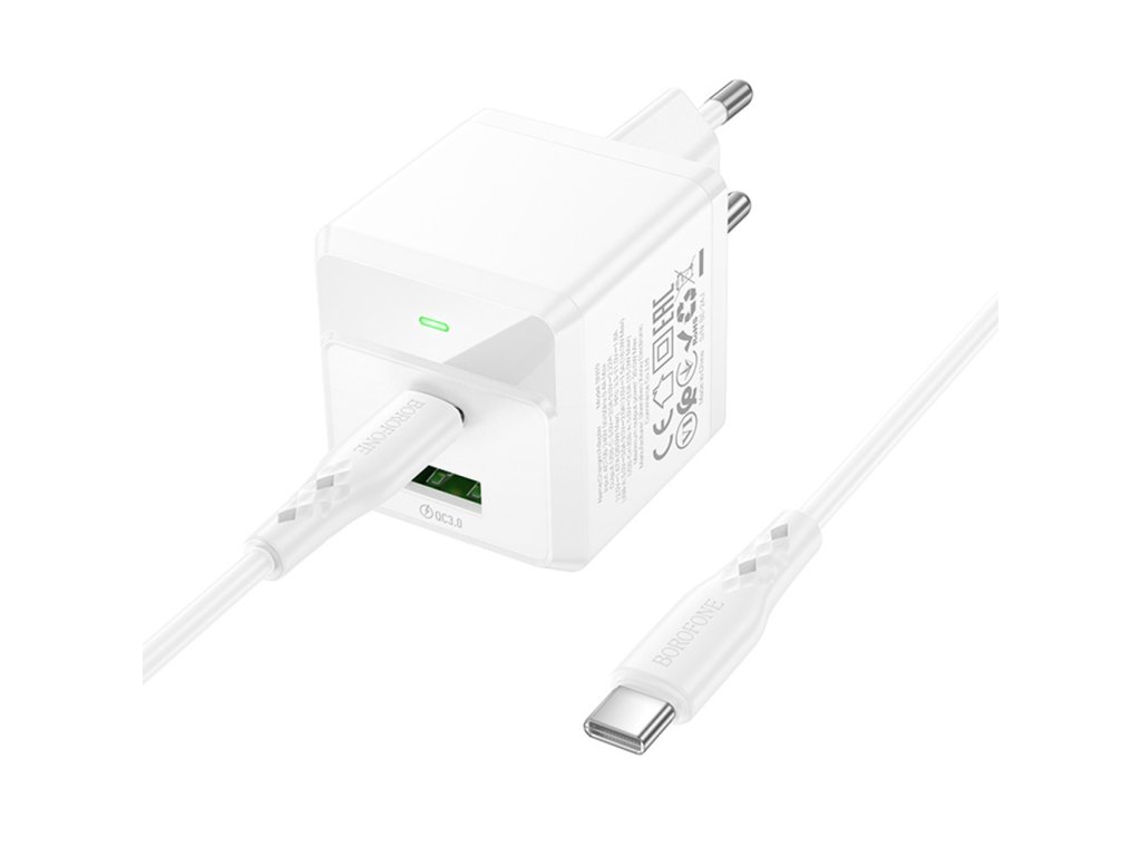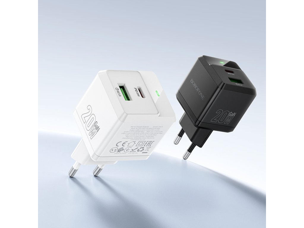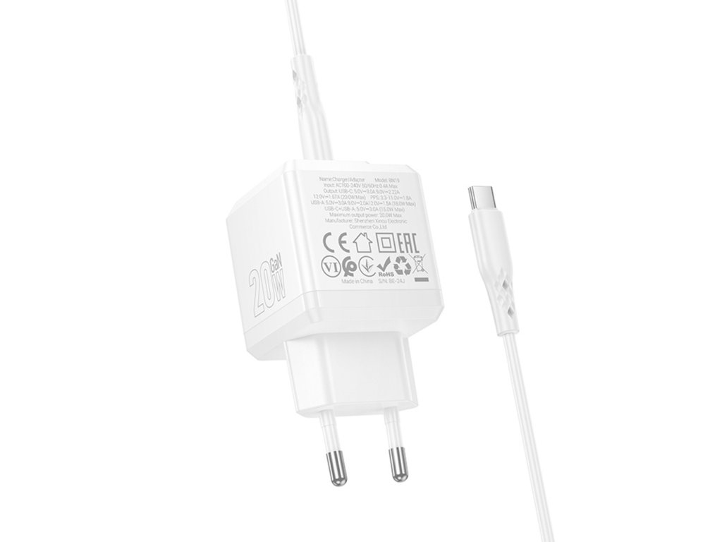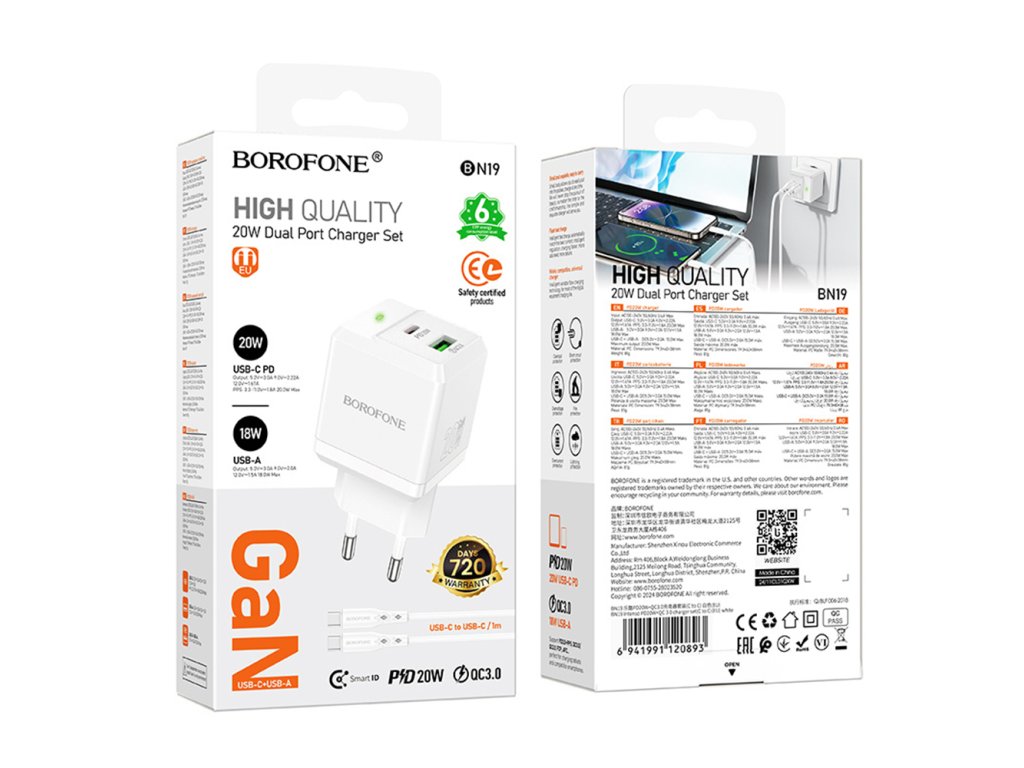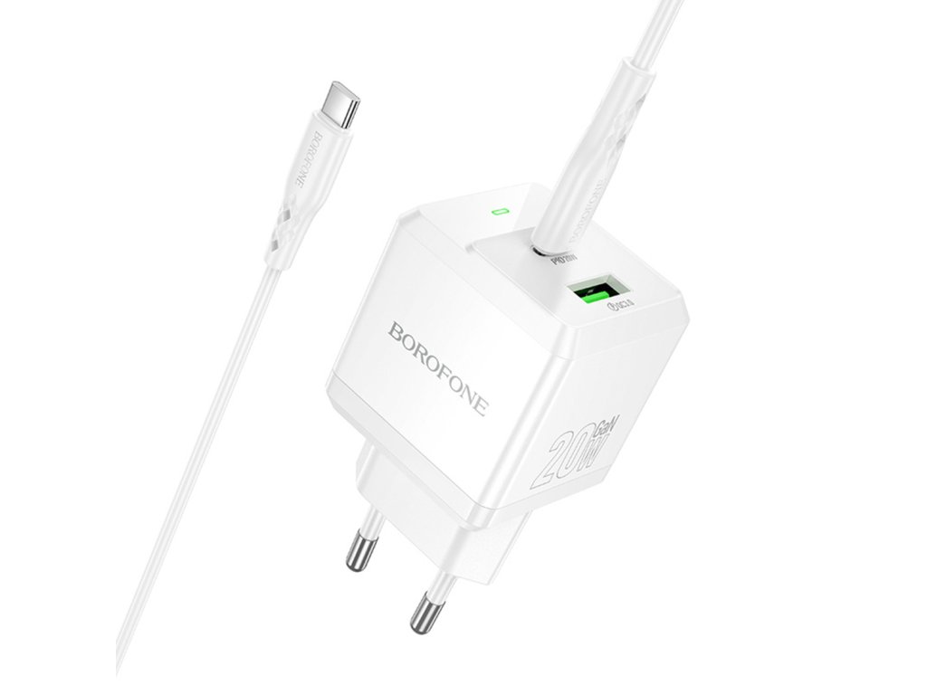 Borofone - Wall Charger Intenso BN19 síťová nabíječka (USB-C kabel v balení, dual port, USB+USB-C, PD20W, QC3.0, 5V/3A) - bílá