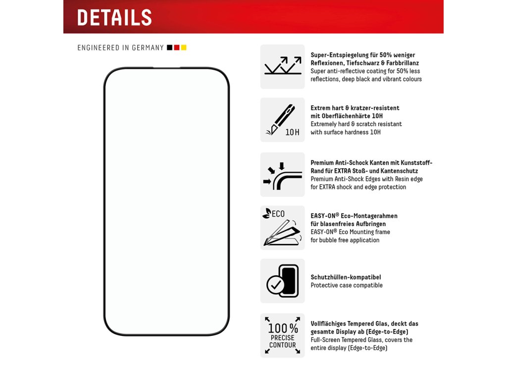Jednodušší. Lepší. Bezpečnější. Ochrana displeje iPhone 16 Pro Max je vyvinuta německými inženýry a při její výrobě jsou použity pouze materiály nepopiratelné kvality. Díky inovativní technologii, s jejíž pomocí byla vyrobena, je prémiová folie Displex výrazně odolnější proti extrémním nárazům a nabízí vynikající optické vlastnosti.