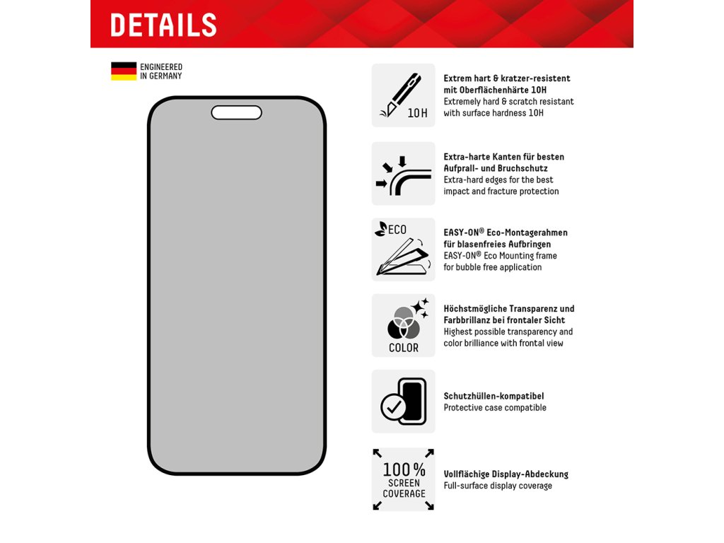 Jednodušší. Lepší. Bezpečnější. Ochrana pro obrazovku iPhone 16 Plus je vyvinuta německými inženýry, a při její výrobě jsou používány pouze materiály nepopiratelné kvality. Díky inovativní technologii, s její pomocí byla vyrobena, je prémiová folie Displex významně odolnější vůči extrémním nárazům, nabízí vynikající optické vlastnosti.