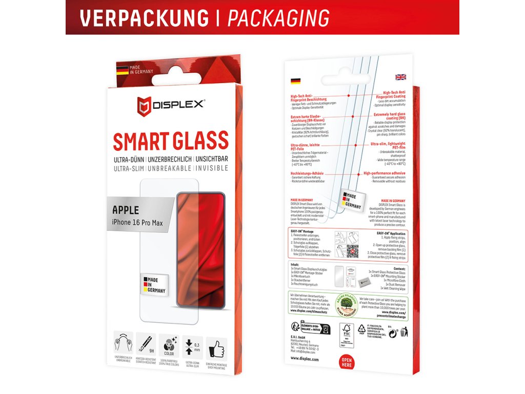 Jednodušší. Lepší. Bezpečnější. Ochrana obrazovky iPhone 16 Pro Max je vyvinuta německými inženýry a při její výrobě jsou použity pouze materiály bez kompromisní kvality. Díky inovativní technologii, s jejíž pomocí byla vyrobena, je prémiová folie Displex výrazně odolnější vůči extrémnímu nárazu a nabízí superiorní optické vlastnosti.