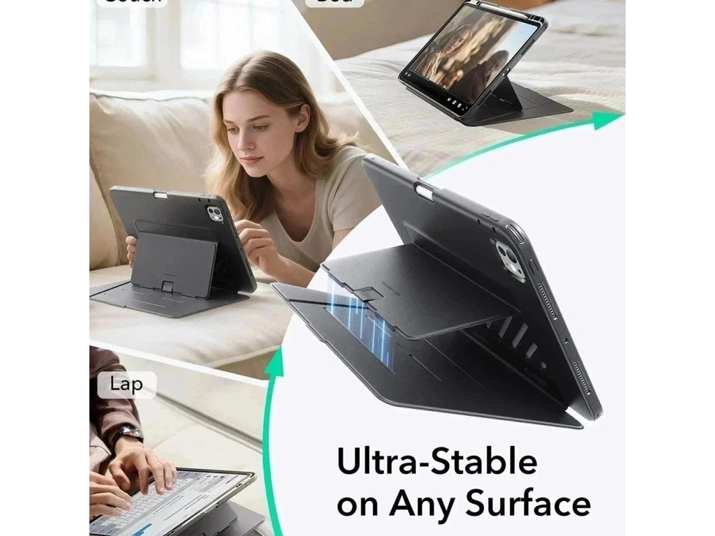 Nyní už nemusíte vybírat. Tento obal pro iPad Pro 11 (2024) umožňuje polohovat tablet jak horizontálně, tak vertikálně. Nemůže být lepší integrovaný stojánek na stůl.
