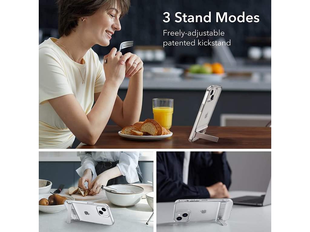 Kryt ESR Air Shield Boost pro iPhone 13, s výklopným stojánkem, vyrobený z pružného silikonu a kompatibilní s funkcí bezdrátového nabíjení, umožňuje umístění telefonu jak ve svislé, tak v horizontální poloze.