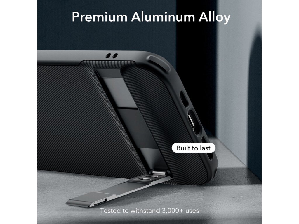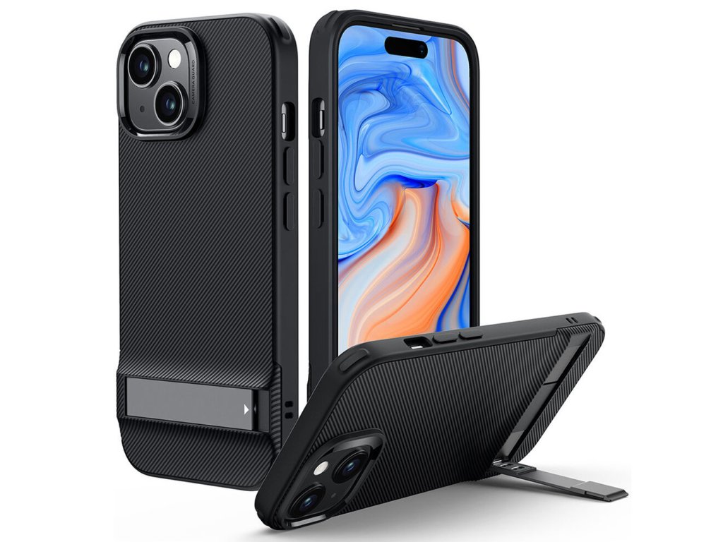 Kryt pro iPhone 15 Plus je vybaven kovovým, výklopným stojánkem, který umožňuje upevnění telefonu v poloze na šířku a usnadňuje pohodlné sledování mediálního obsahu.