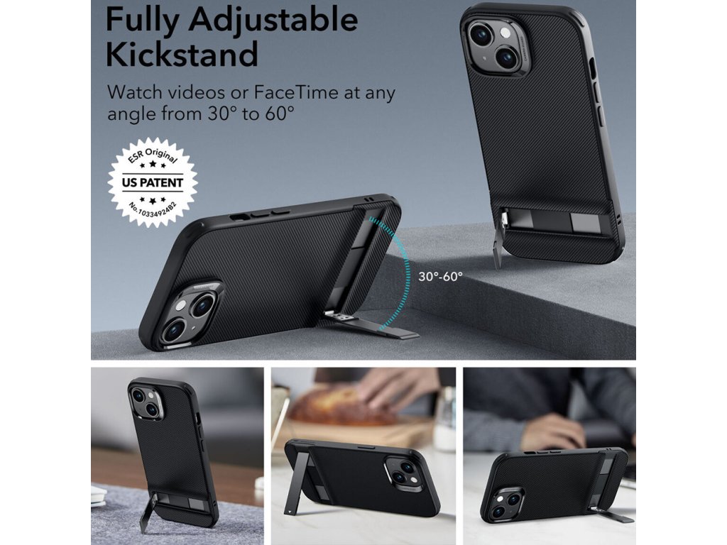 Kryt ESR Air Shield Boost pro iPhone 15 Plus, s výklopným stojánkem, vyrobený z flexibilního silikonu a kompatibilní s bezdrátovým nabíjením, umožňuje umístění telefonu jak na výšku, tak na šířku.