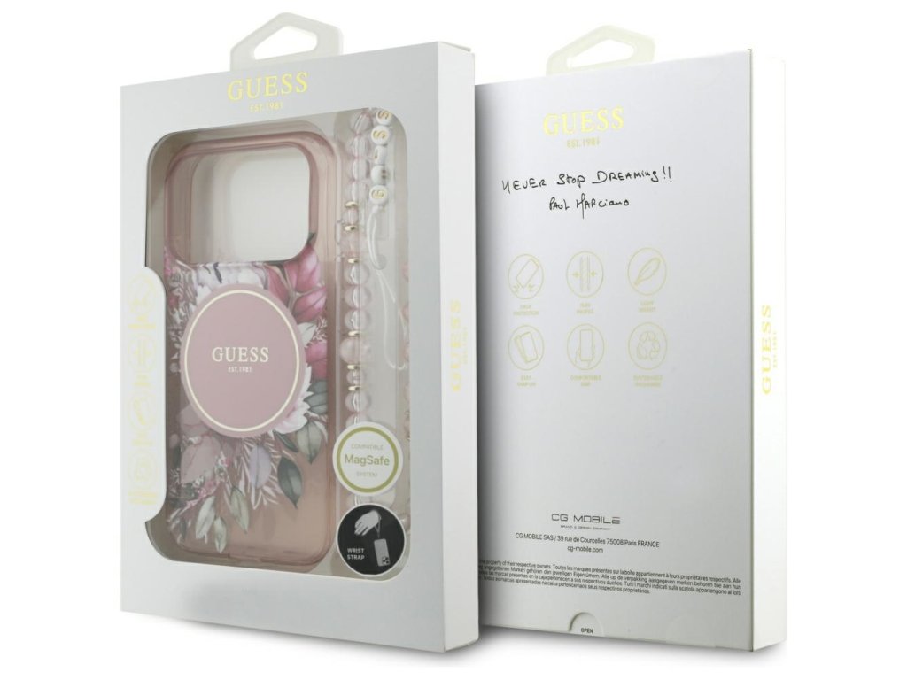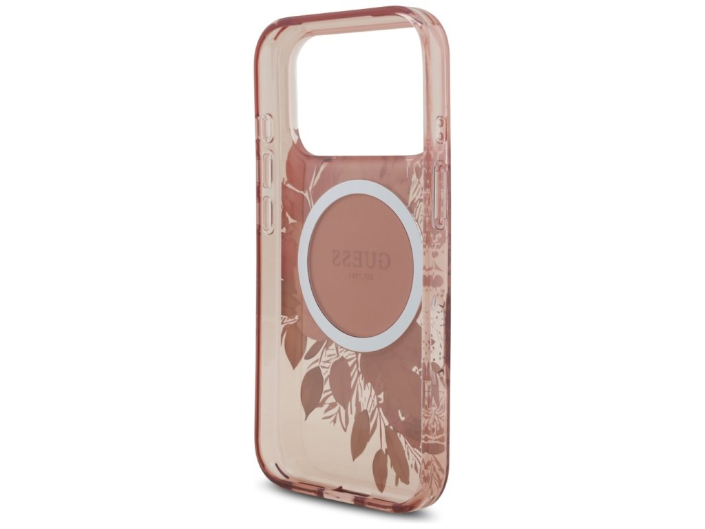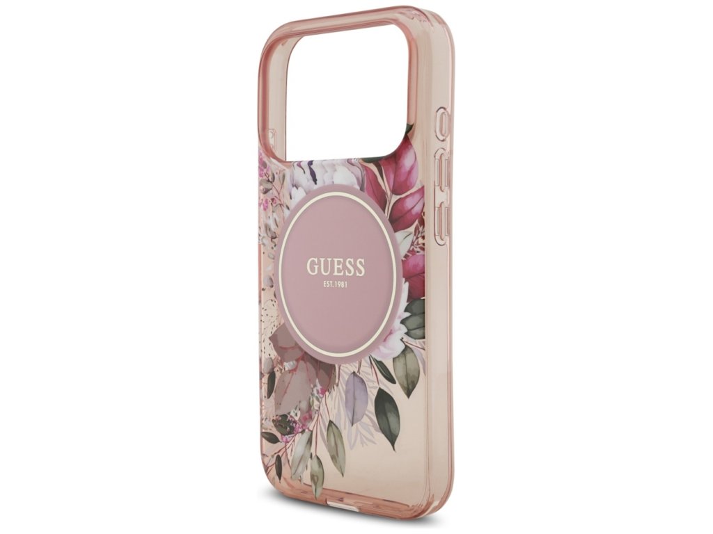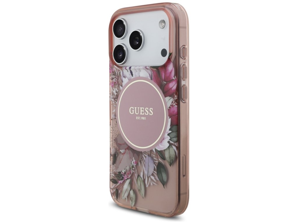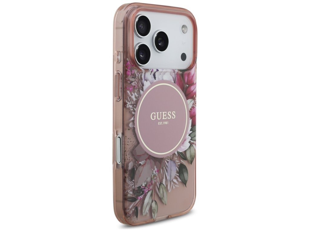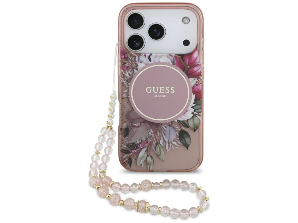 Guess – IML Flowers with Pearl Strap MagSafe obal na iPhone 17 Pro – růžový