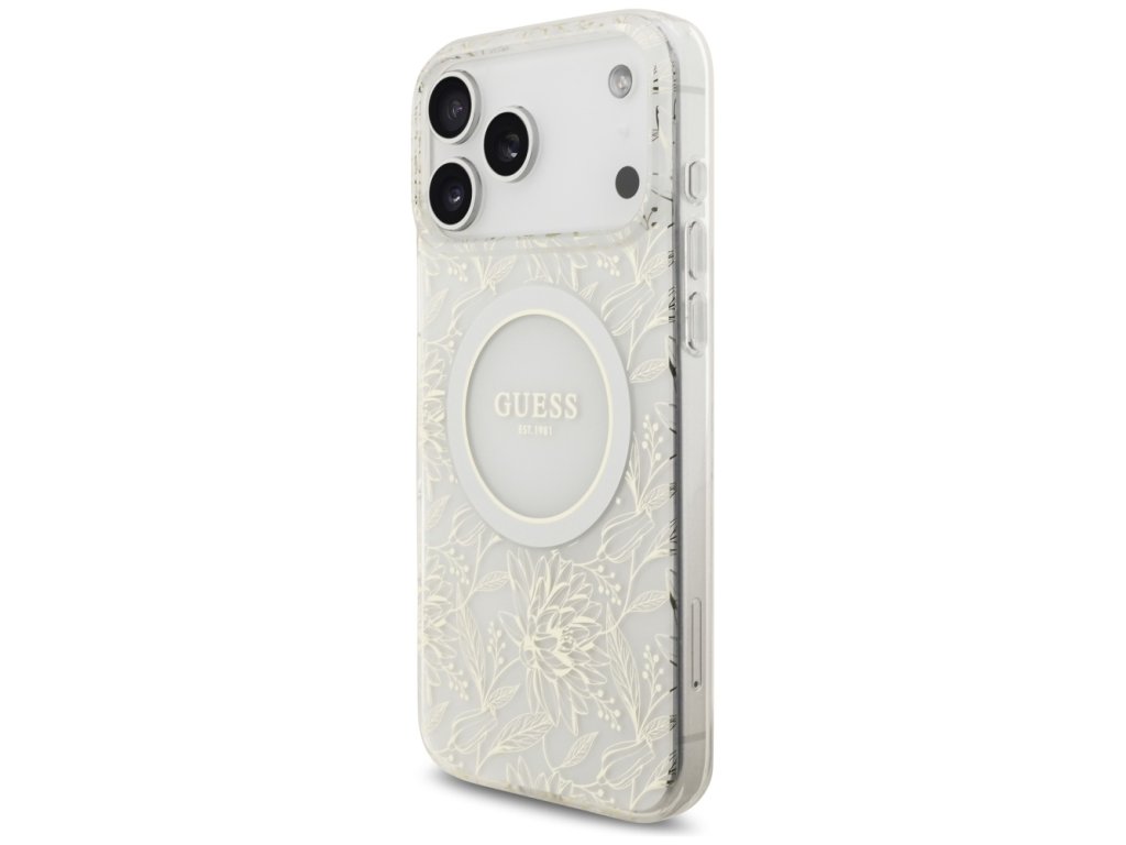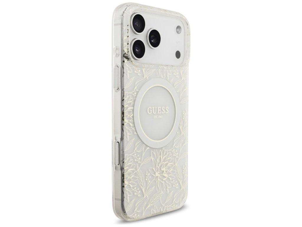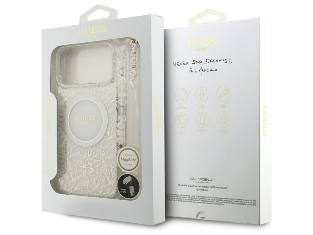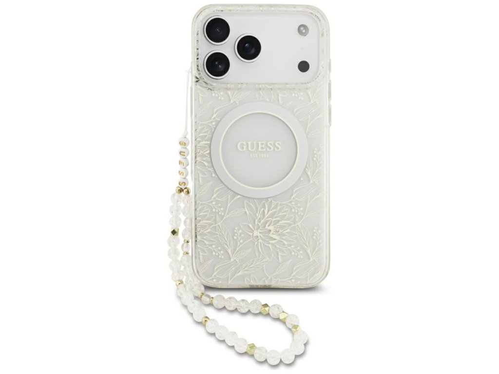 Guess - IML Flowers Allover Electroplated with Pearl Strap MagSafe pouzdro pro iPhone 17 Pro Max - bílé