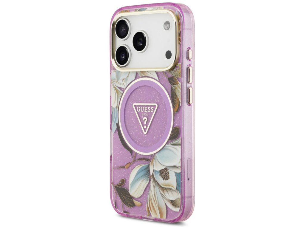 Guess - IML Glitter Flowers Triangle MagSafe pouzdro pro iPhone 17 Pro Max - fialové
