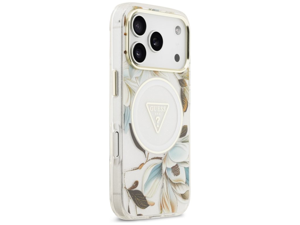 Guess - IML Metal Glitter Flowers Triangle MagSafe pouzdro pro iPhone 17 Pro - bílé