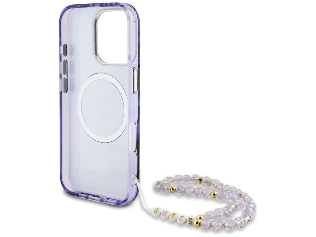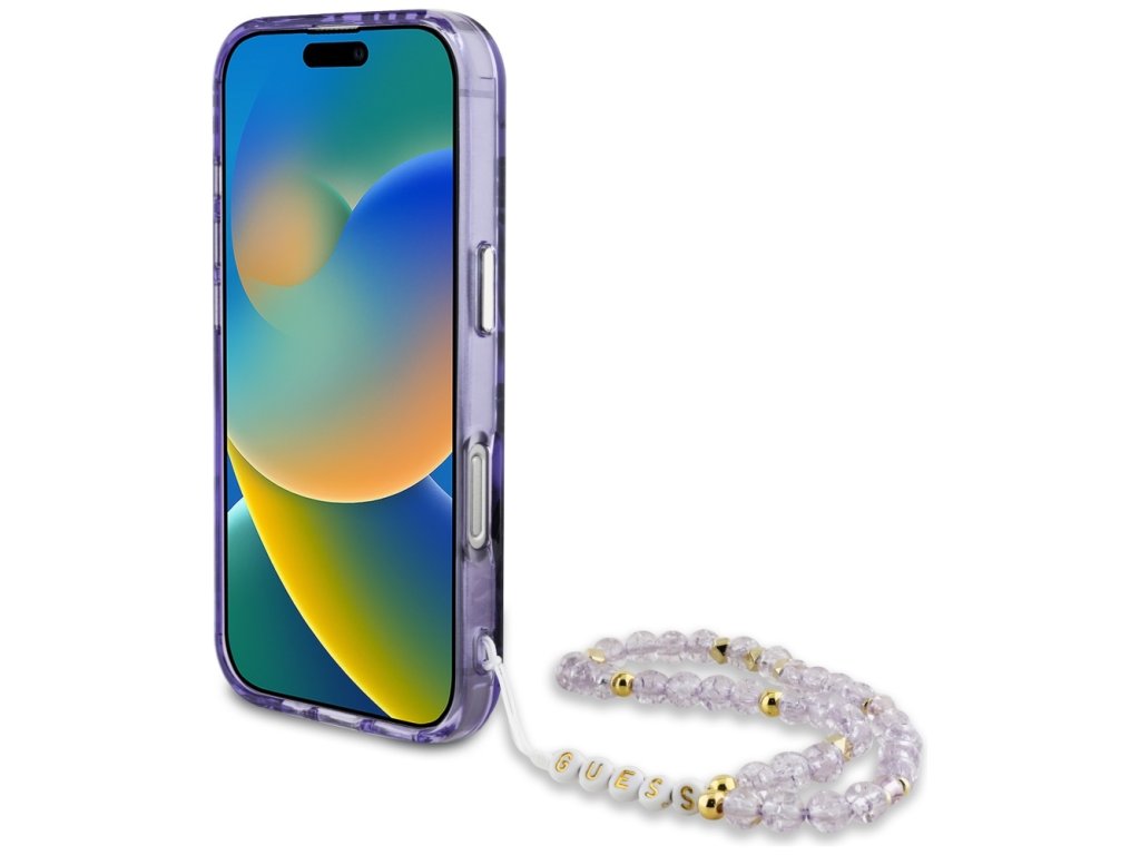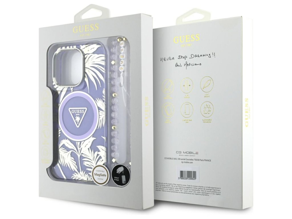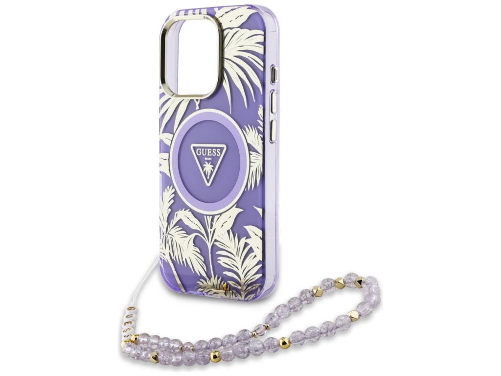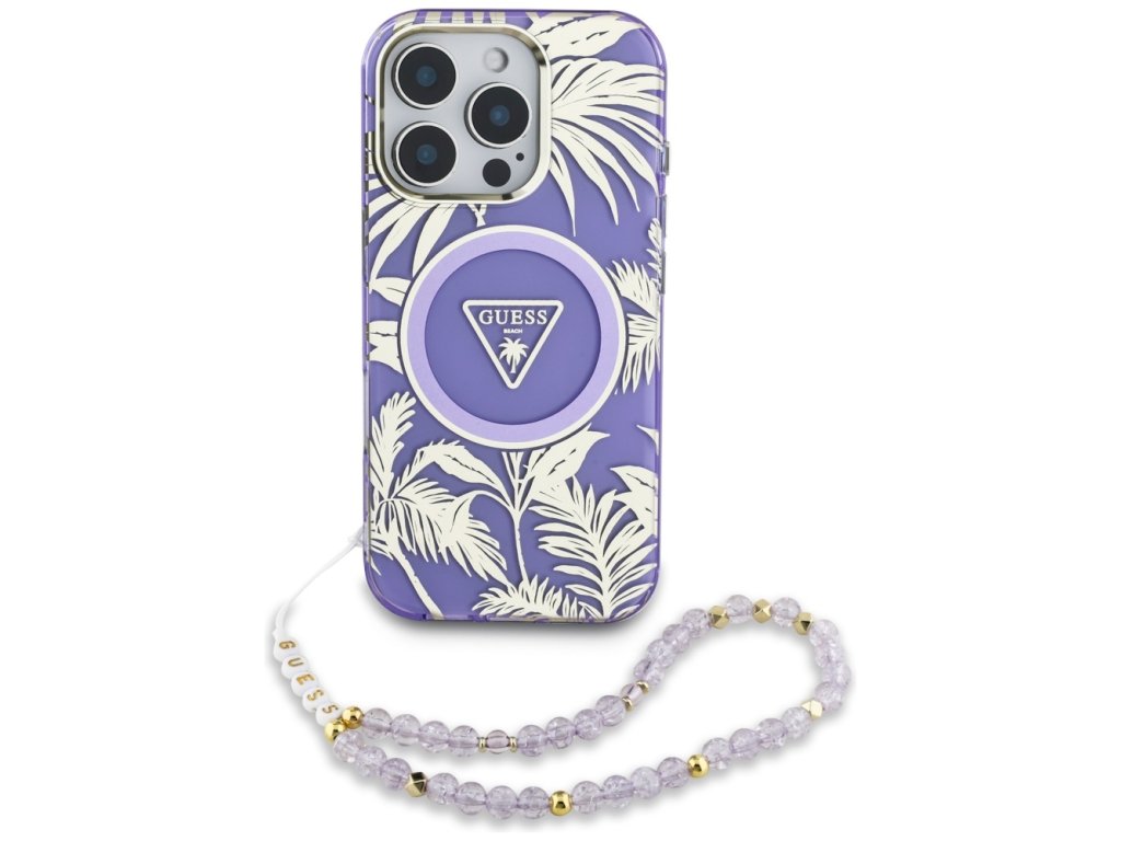 Guess IML Palm Trees Triangle with Pearl Strap MagSafe kryt na iPhone 16 Pro Max – fialový