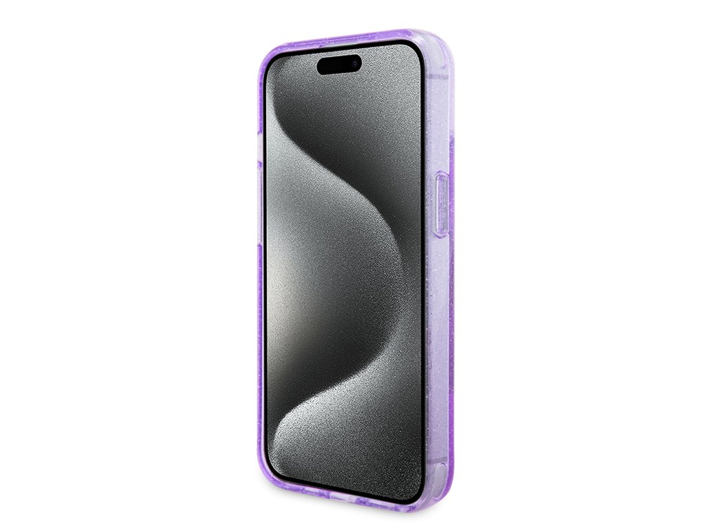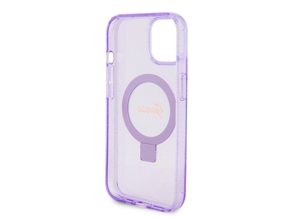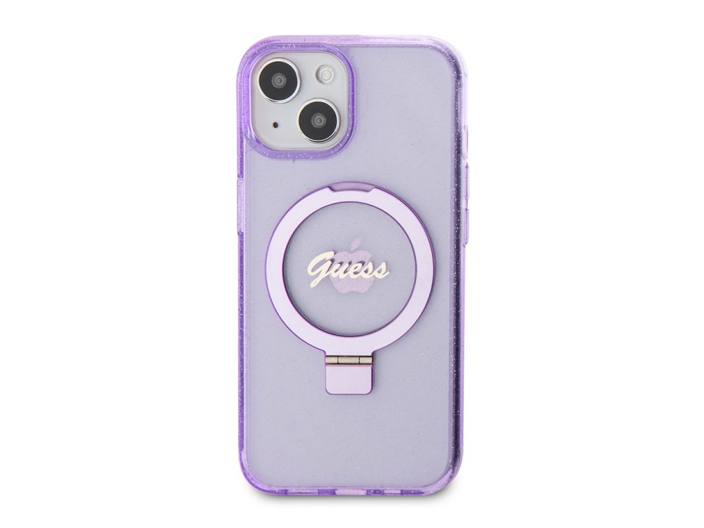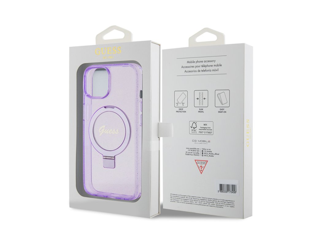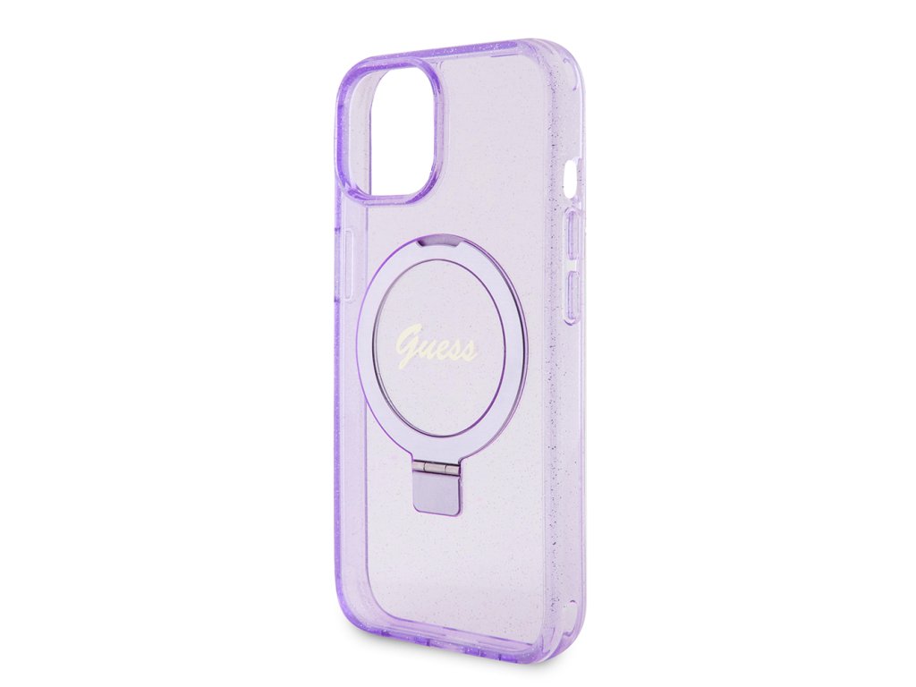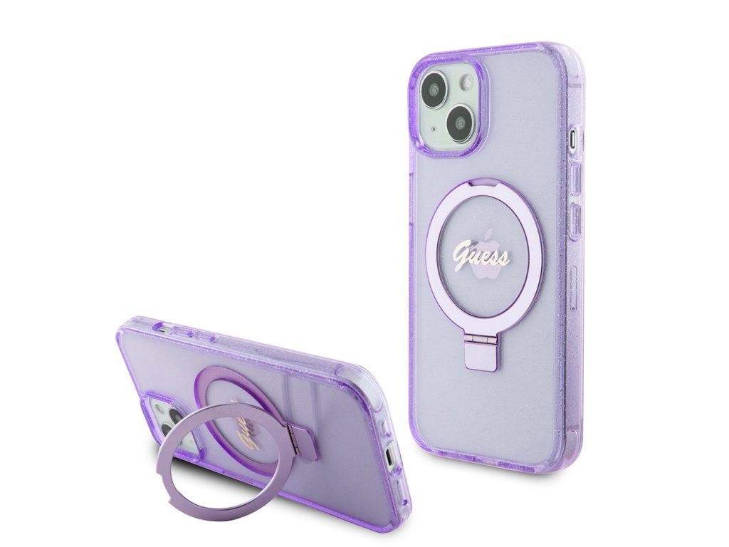 Guess kroužkový držák Script Glitter s MagSafe na iPhone 15 Plus (GUHMP15MHRSGSU) - fialový