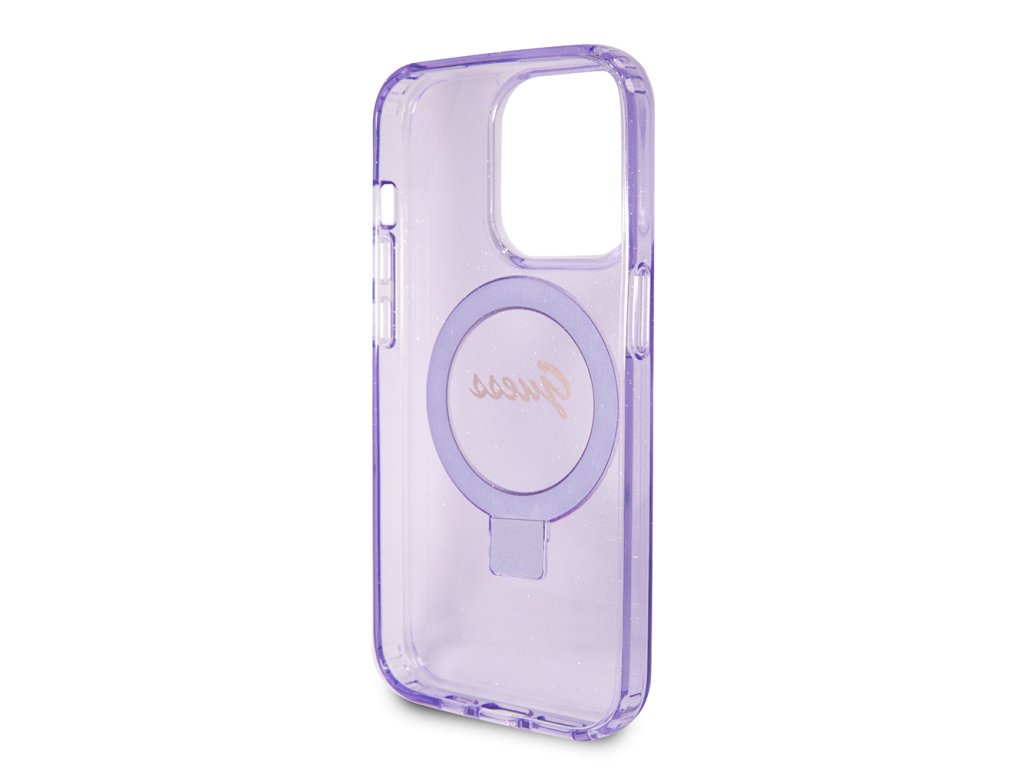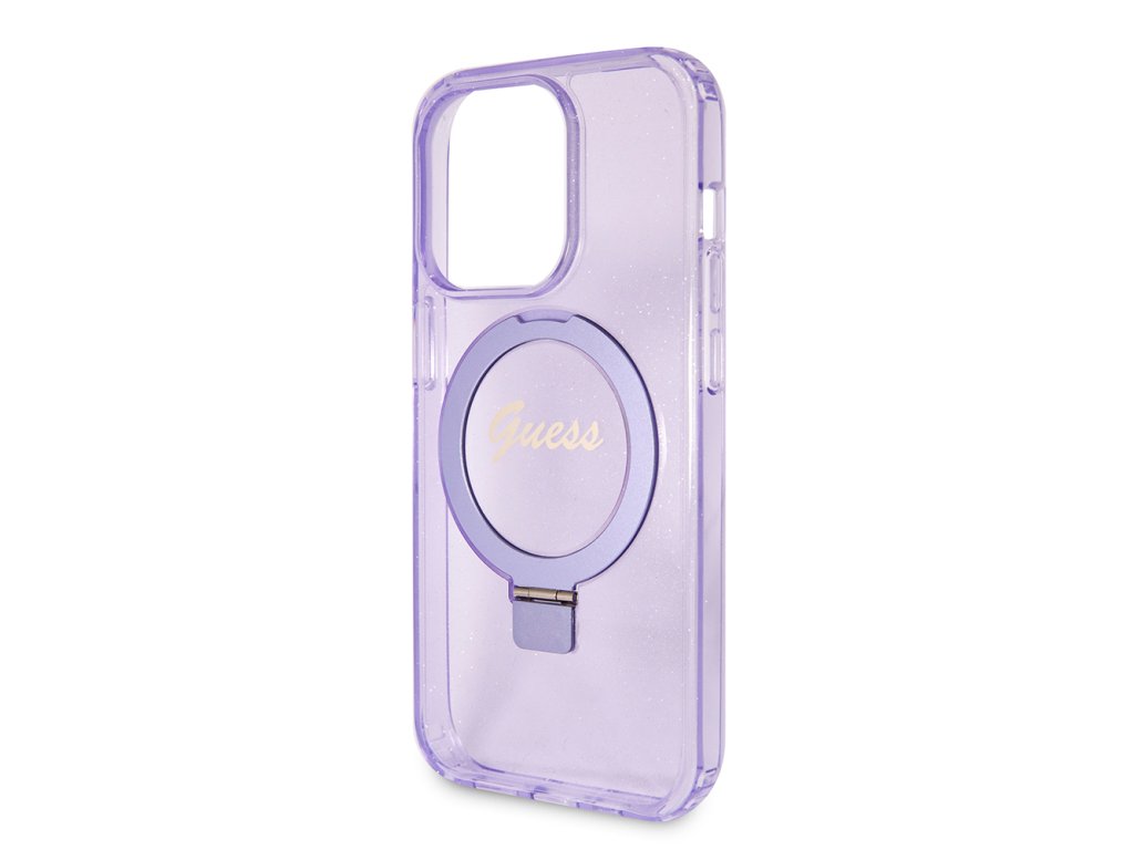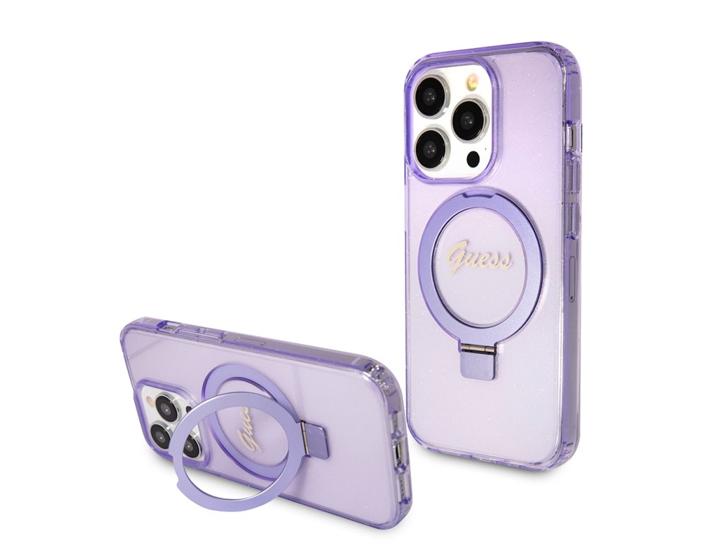 Guess kroužkový držák Script Glitter s MagSafe na iPhone 15 Pro (GUHMP15LHRSGSU) - fialový