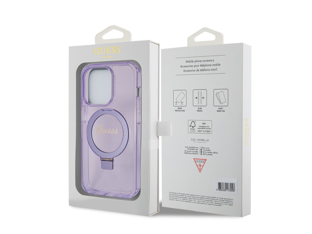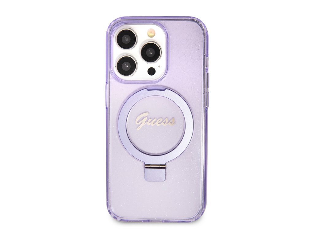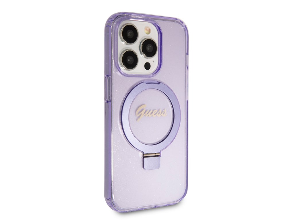 Guess kroužkový držák Script Glitter s MagSafe na iPhone 15 Pro Max (GUHMP15XHRSGSU) - fialový