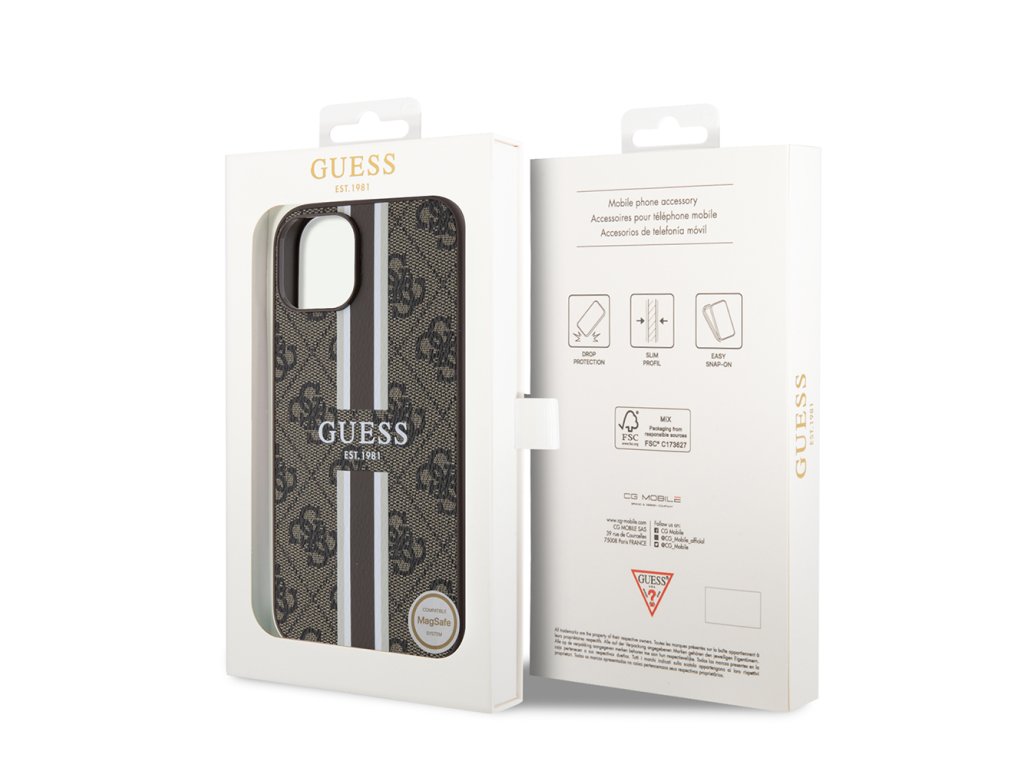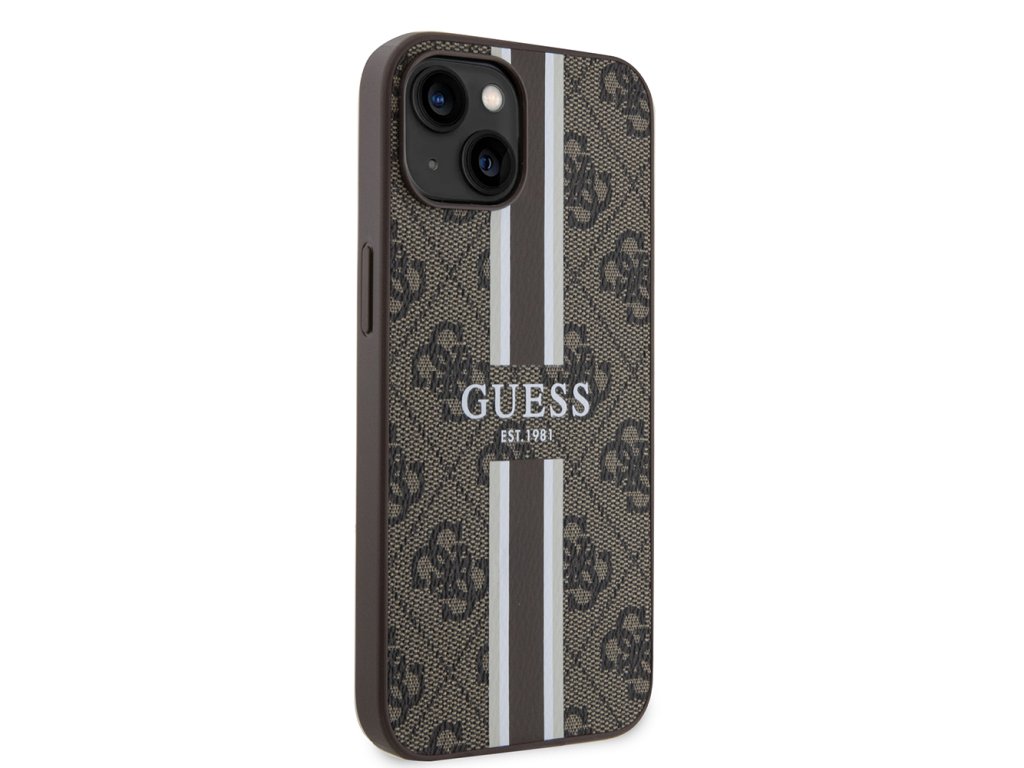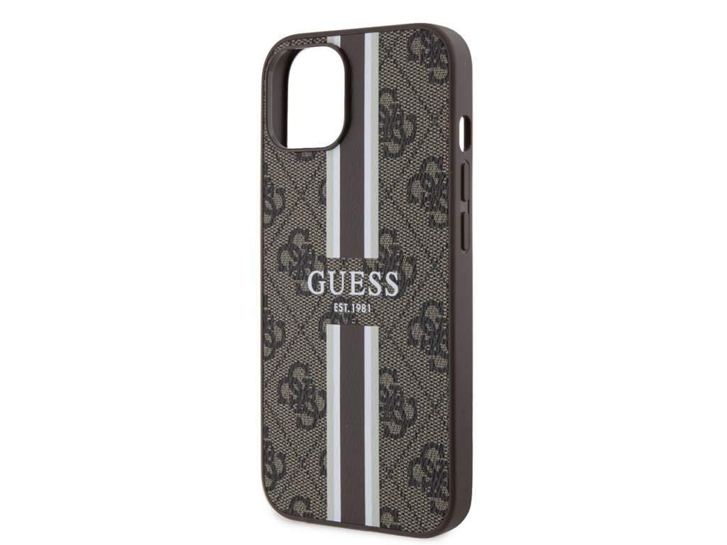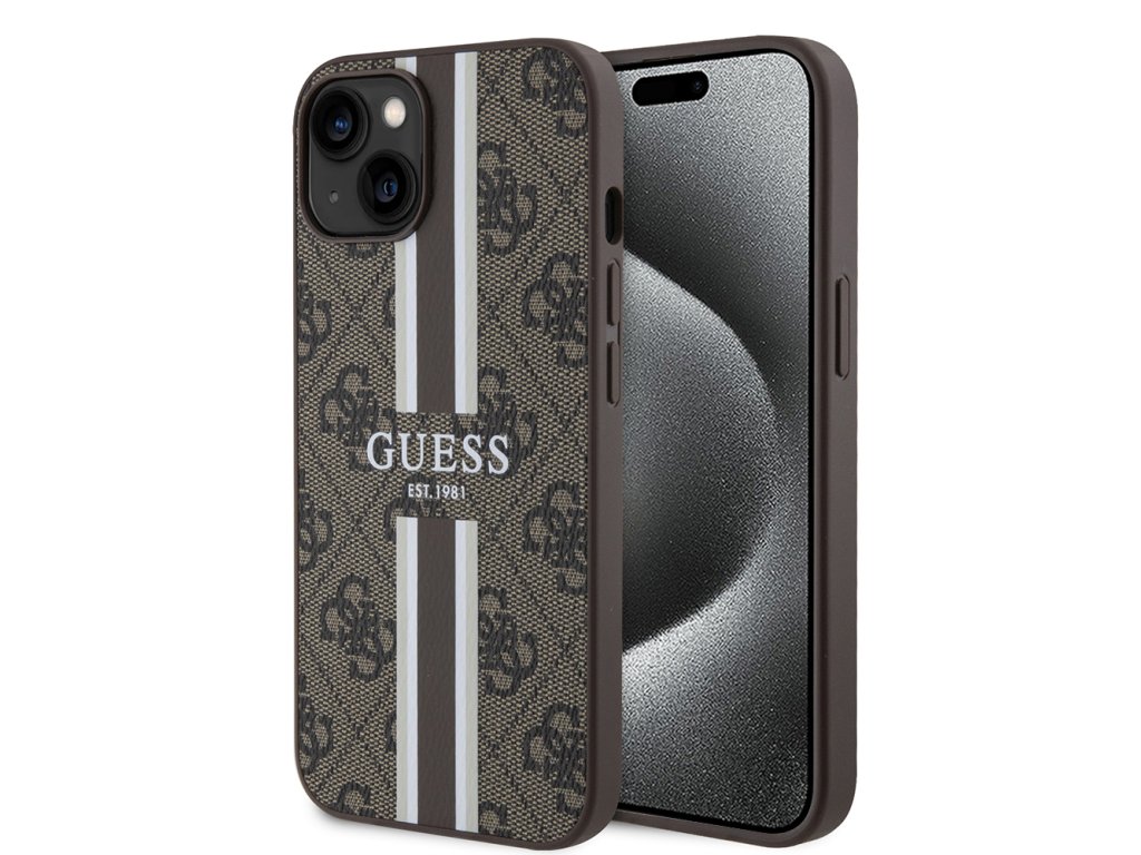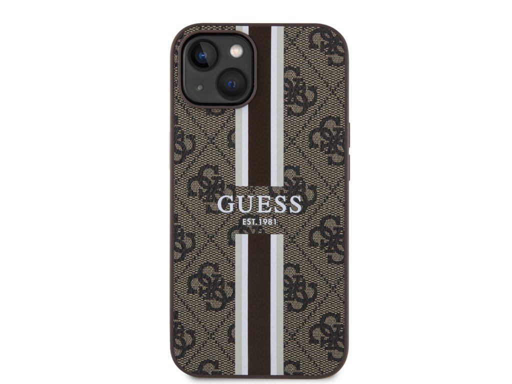Guess pevný kryt 4G s potištěnými pruhy a MagSafe na iPhone 15 (GUHMP15SP4RPSW) - hnědý