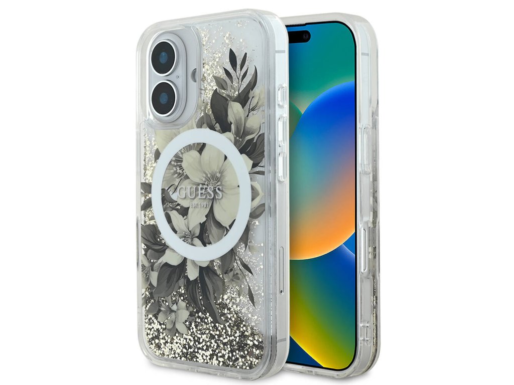 Guess třpytivý kryt s květem a MagSafe na iPhone 16 (GUHMP16SLFMWTE) - béžový