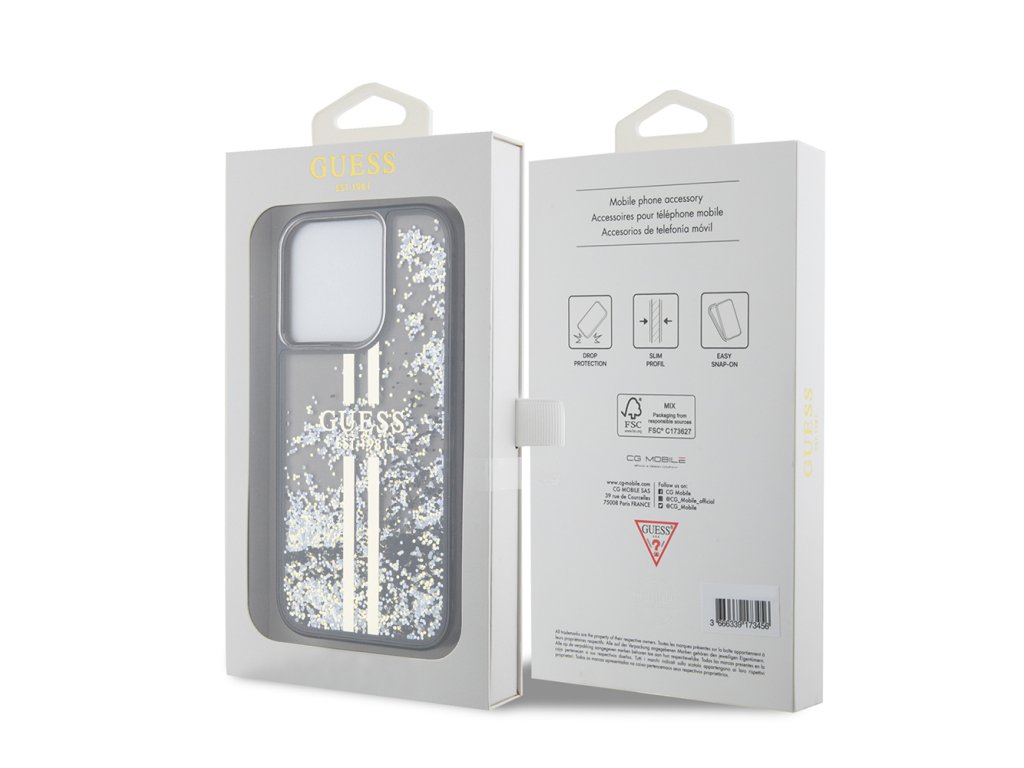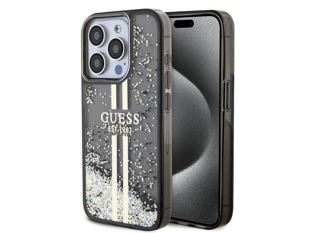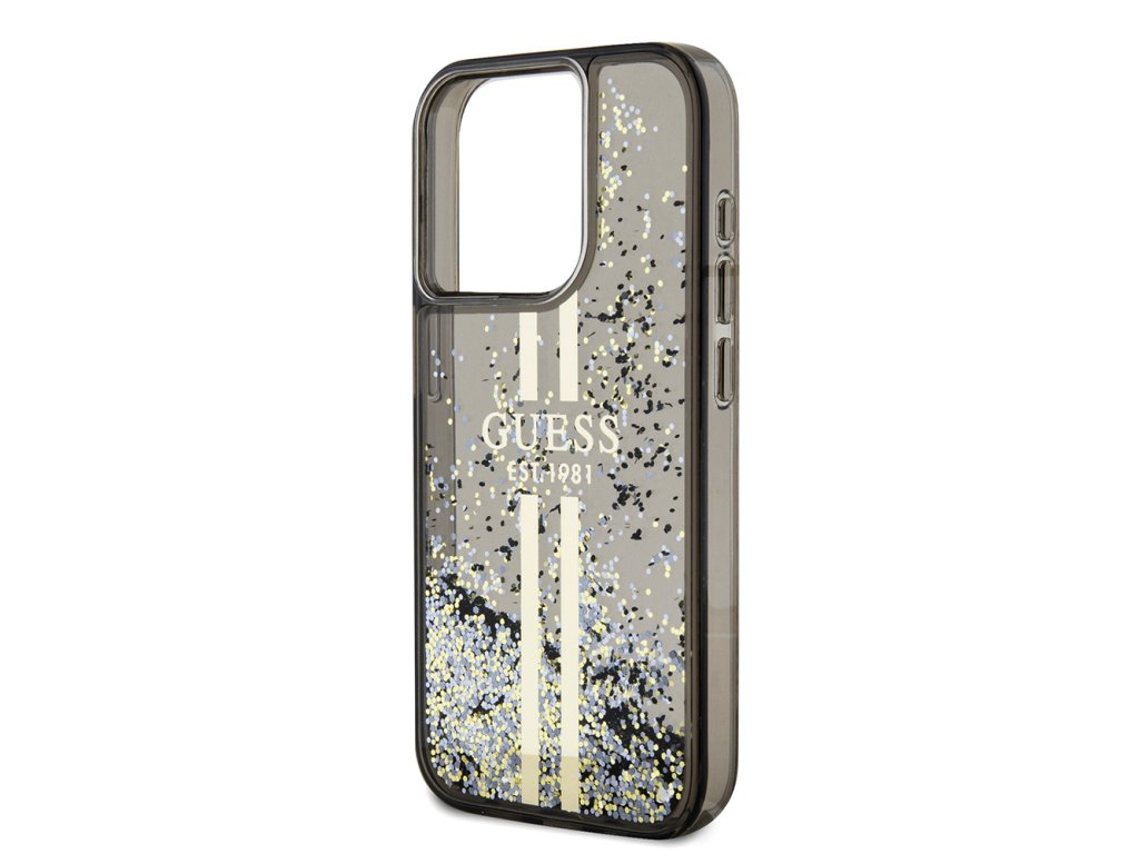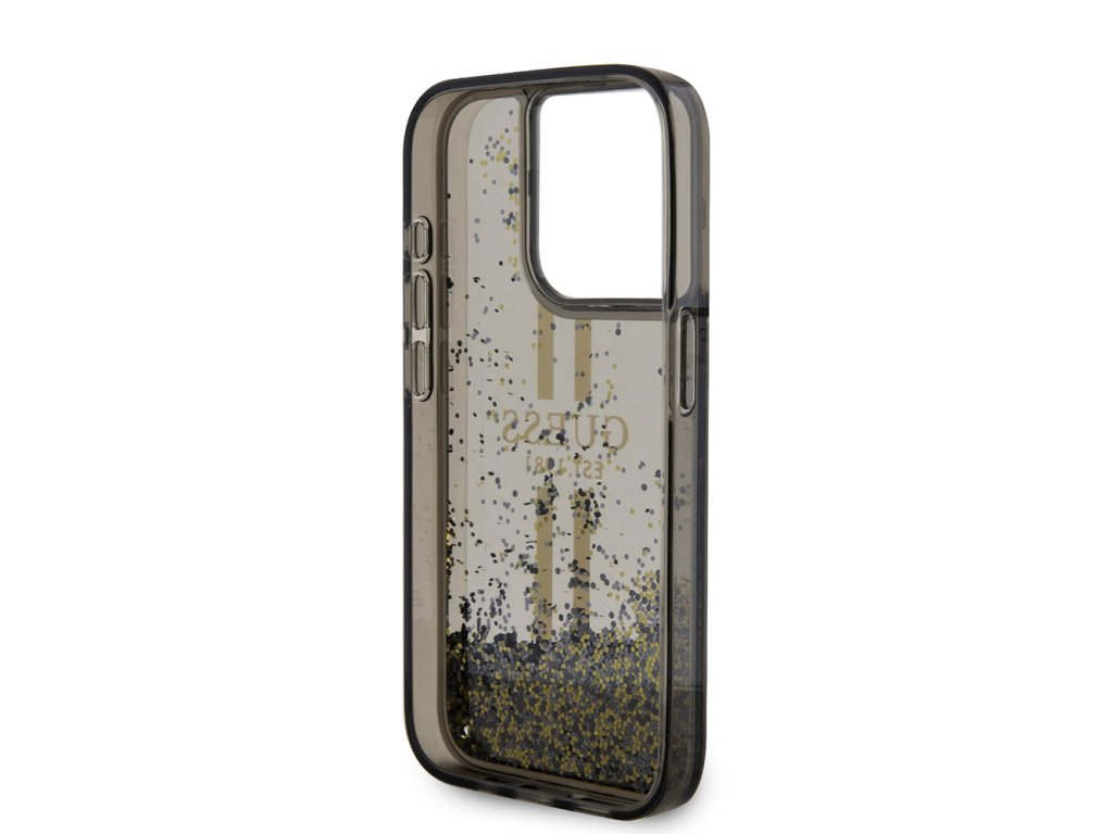Guess třpytivý kryt se zlatými pruhy a tekutinou pro iPhone 15 Pro (GUHCP15LLFCSEGK) - černý