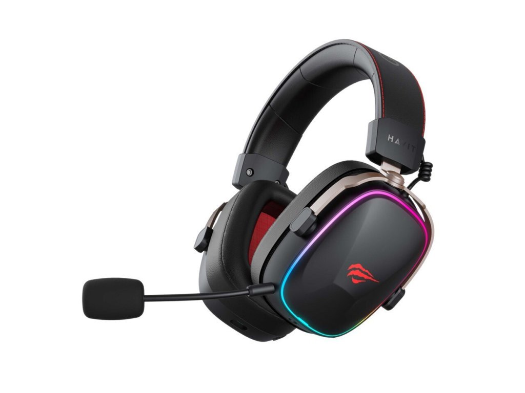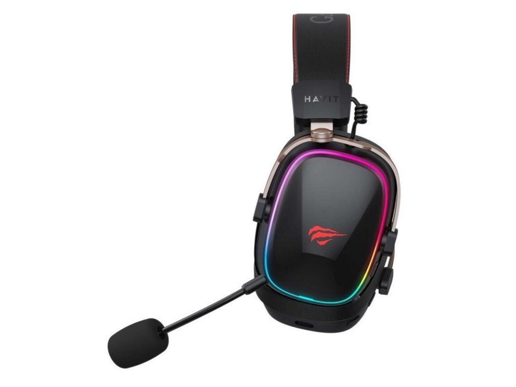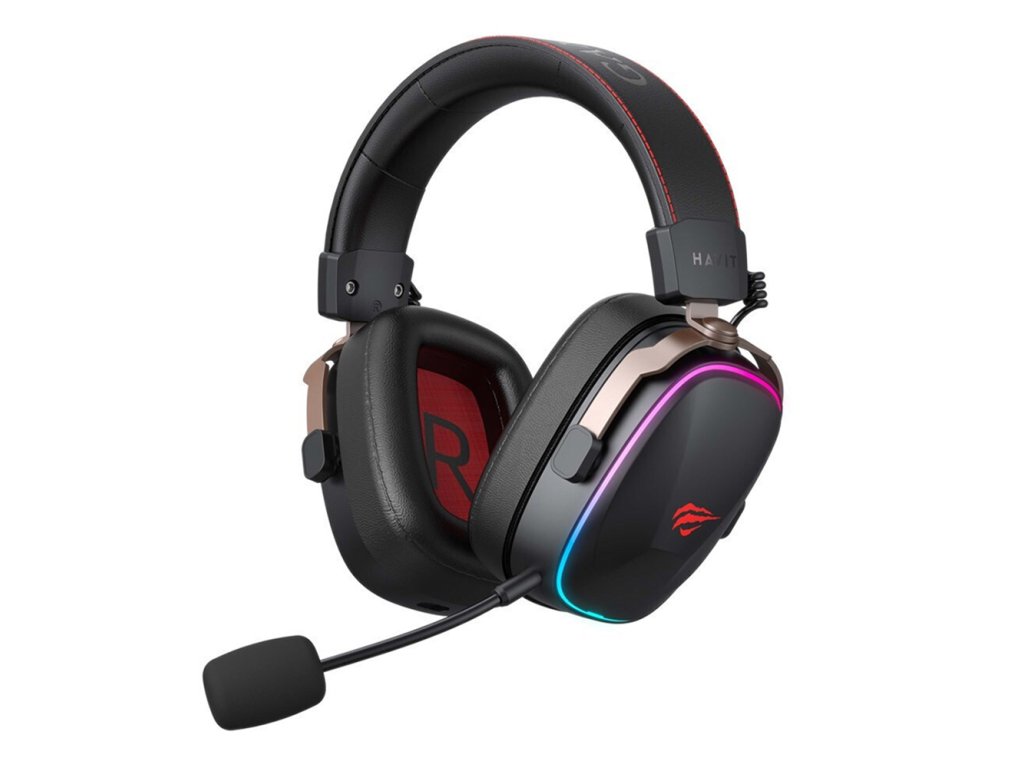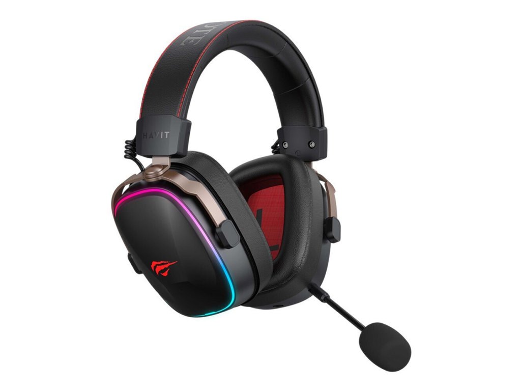 Havit - Bezdrátová sluchátka pro hraní, kolem uší, Bluetooth, mikrofon, LED, 1050mAh, USB-C - černé / okrové