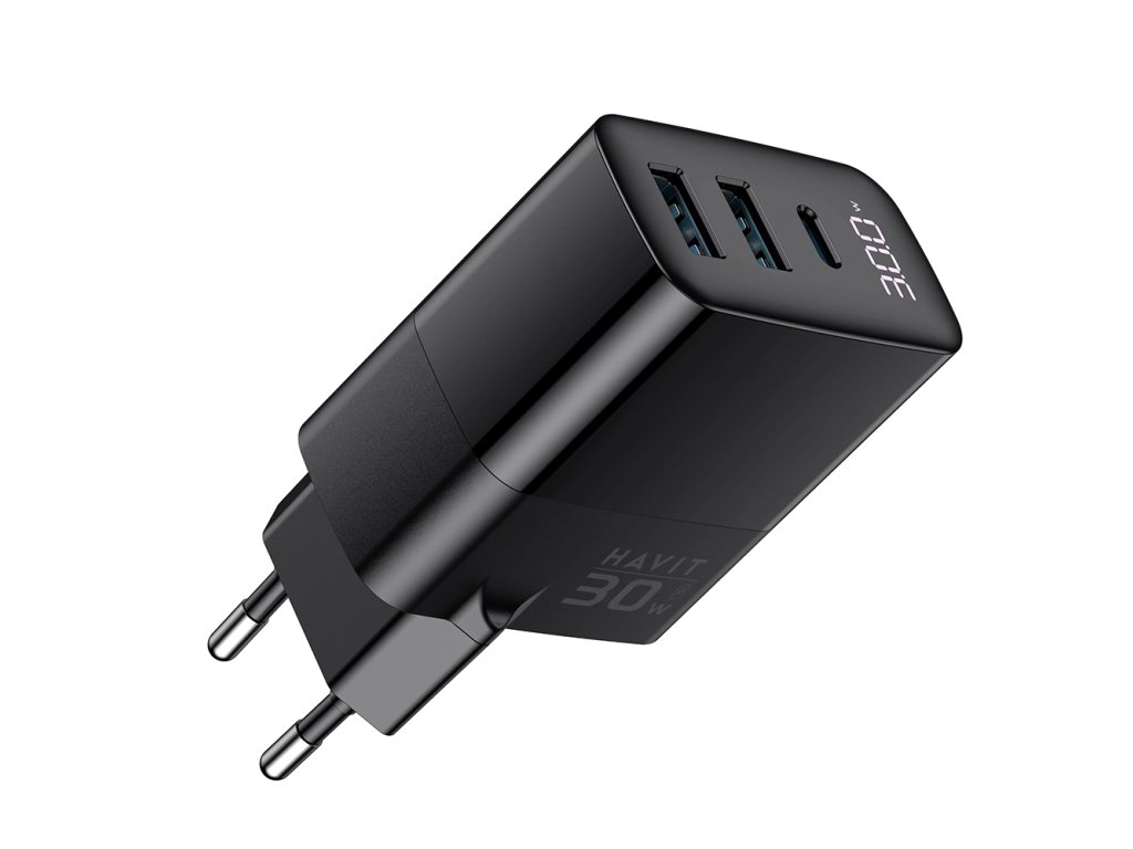 Havit - Wall Charger UCLE001 EU síťová nabíječka (2× USB, USB-C, 30W, GaN technologie) - černá