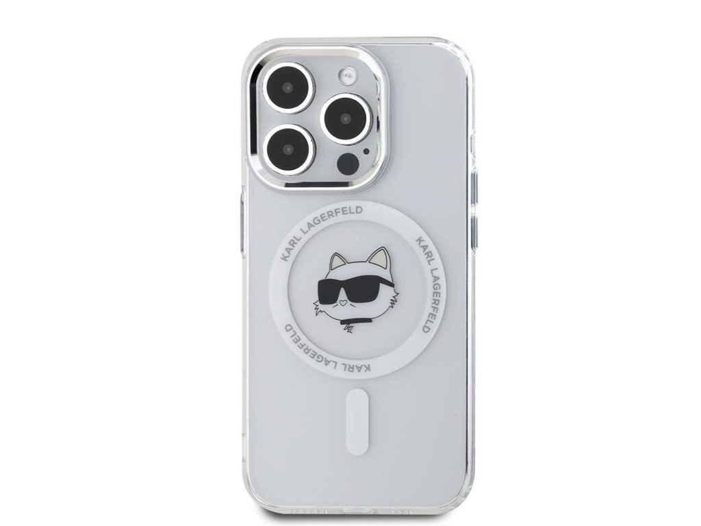 Karl Lagerfeld IML MagSafe kryt pro iPhone 15 Pro (KLHMP15LHLSCHH) - bílá kovová Choupette hlava