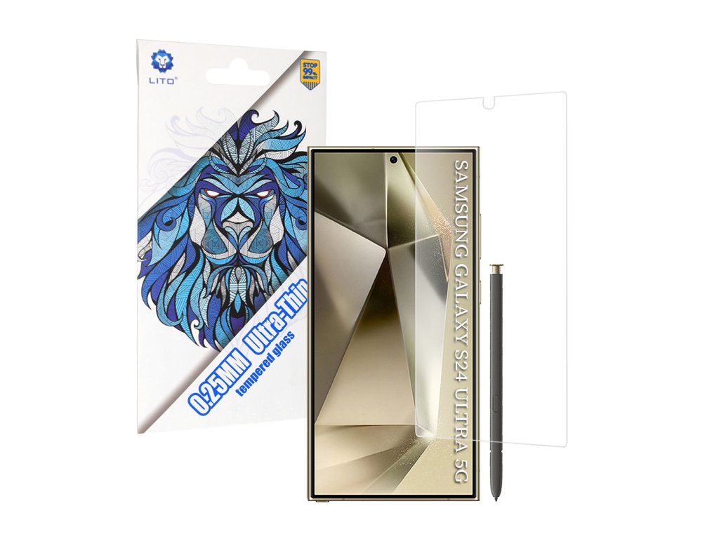 Lito 9H Tempered Glass pro Samsung Galaxy S24 Ultra, průhledná, která dokonale odráží barvy zobrazené na displeji, nijak neovlivňuje citlivost displeje.