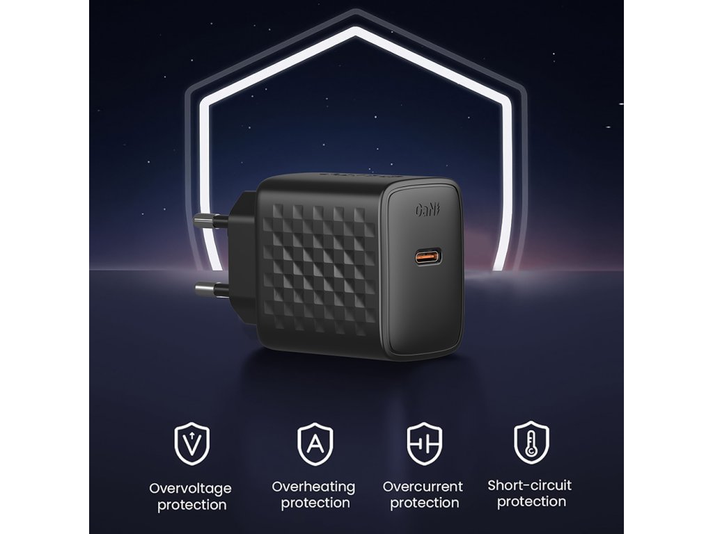 Zásuvková nabíječka Type-C je vybavena několika ochrannými systémy proti přepětí, přetížení a přehřátí.