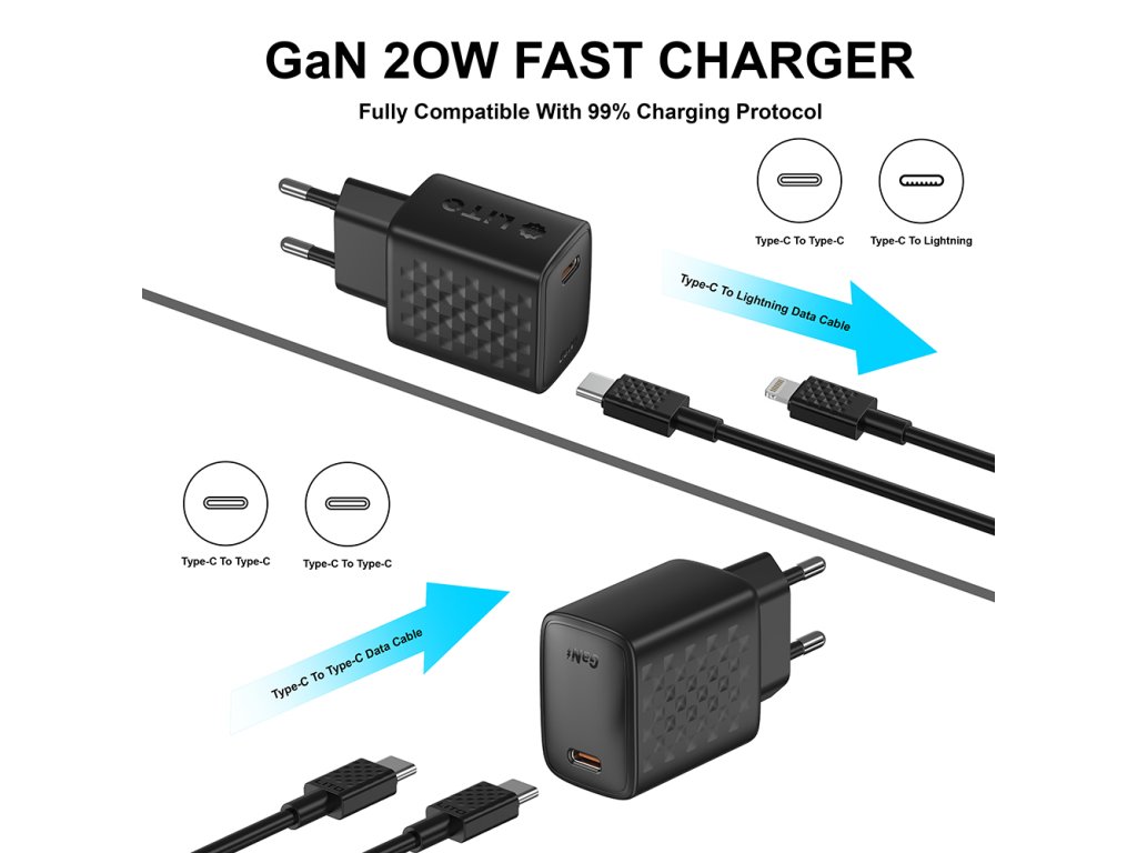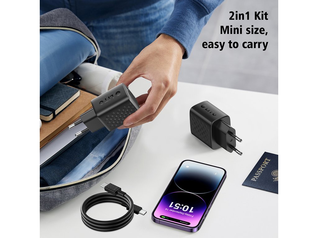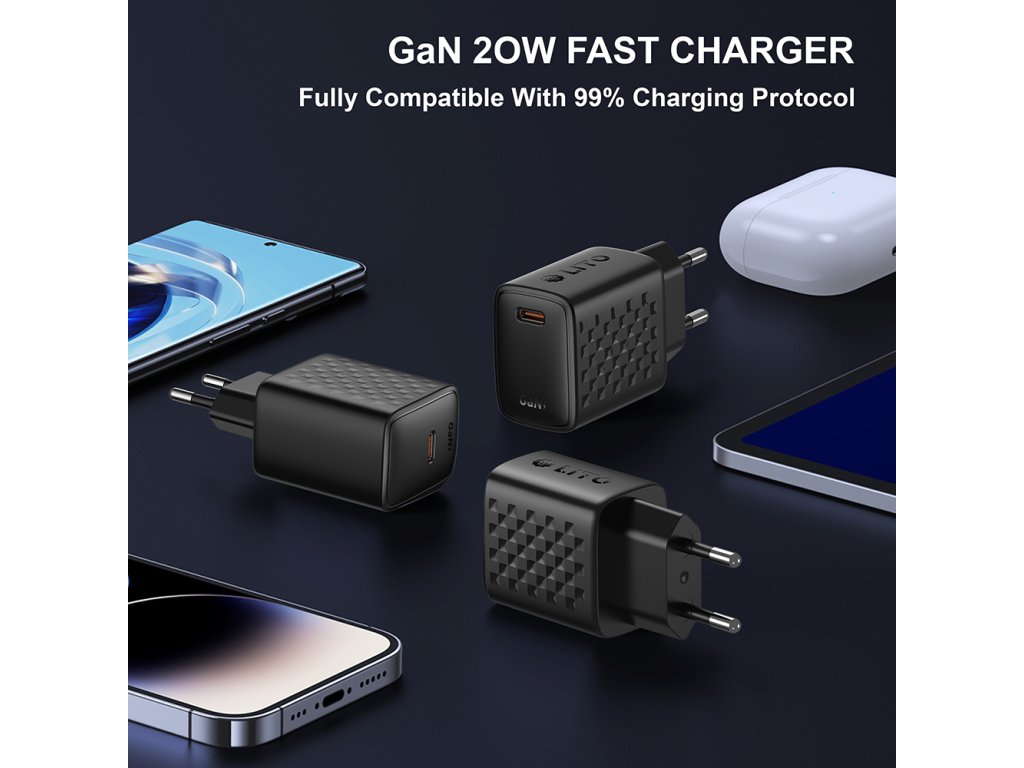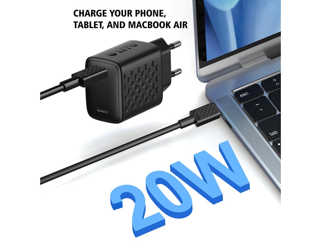 Lito - Wall Charger LC13T síťová nabíječka (USB-C kabel v balení, USB-C, PD20W, GaN technologie, nehořlavý PC materiál, EU vidlice) - černá
