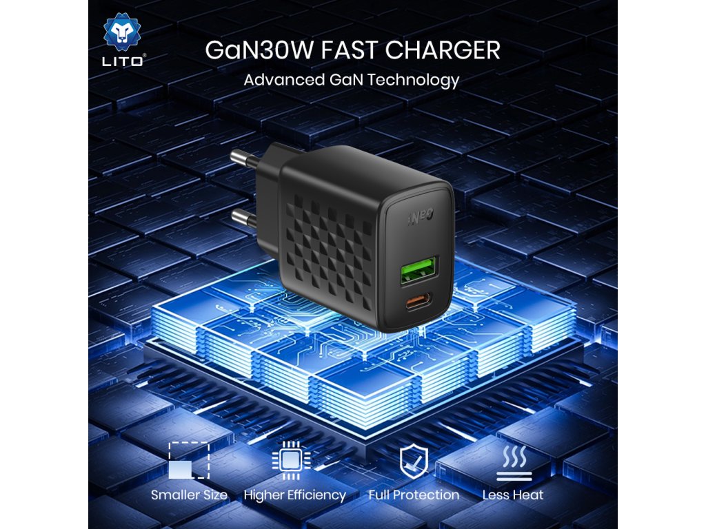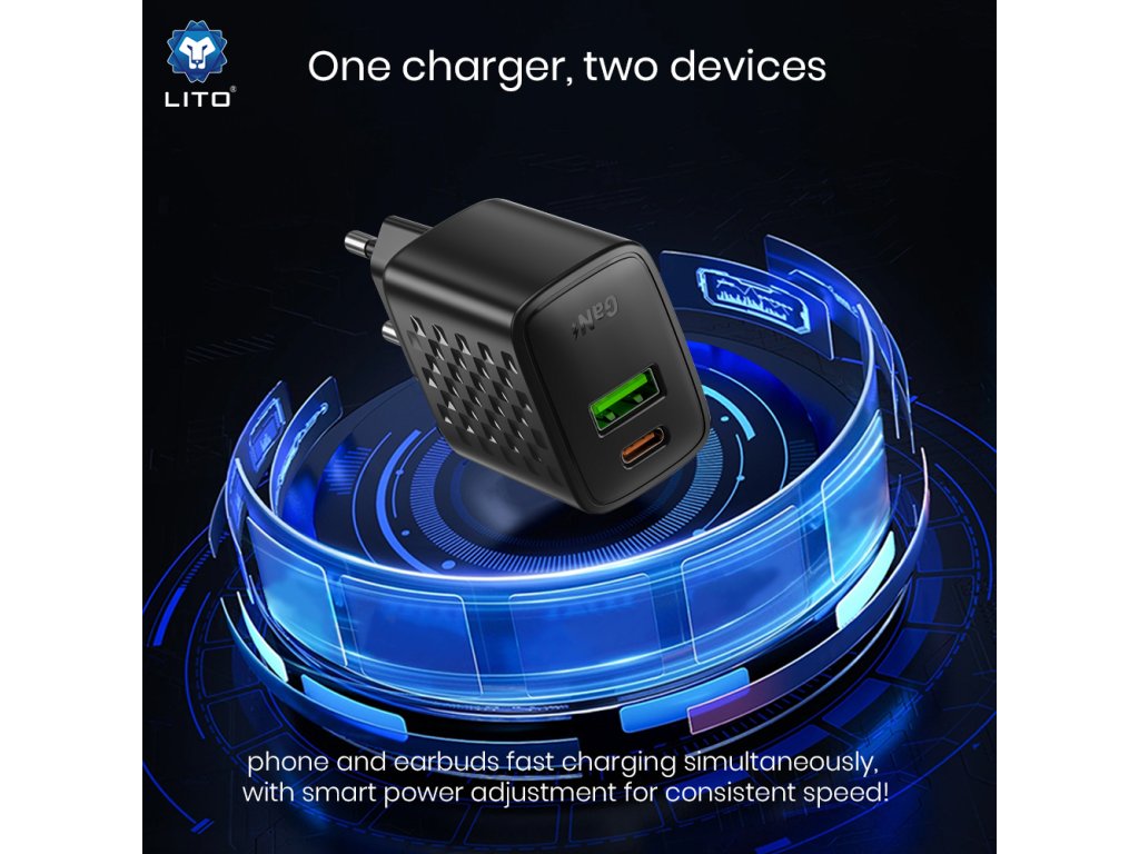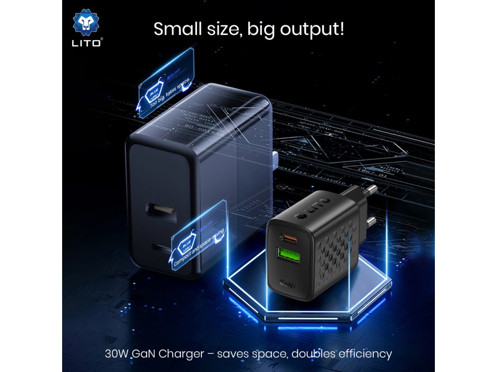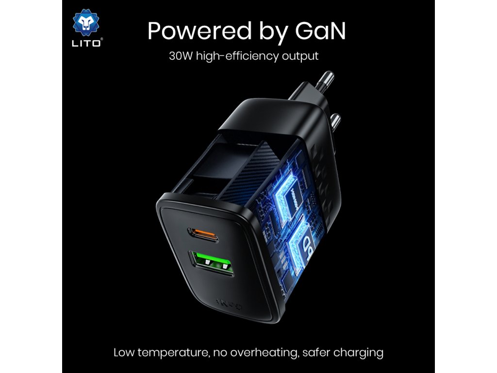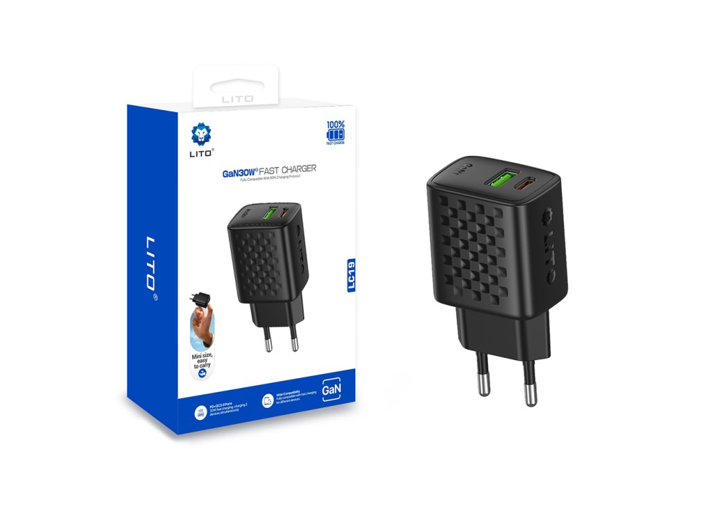 Lito - Wall Charger LC19 síťová nabíječka (USB-C+USB, PD30W, GaN technologie, nehořlavý PC materiál, EU vidlice) - černá