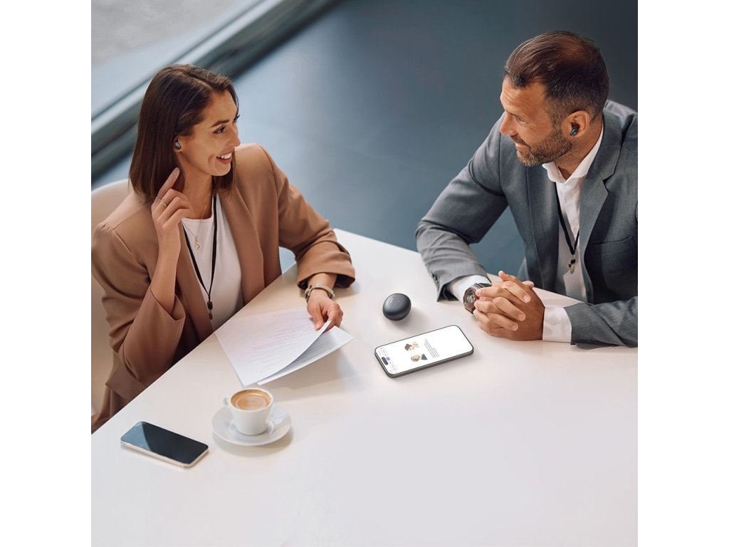 Balení obsahuje: 1x sluchátka, 3x silikonové ochrany (S, M, L), 1x pouzdro, 1x nabíjecí kabel USB-C.