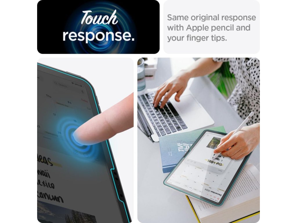 Fólie iPad Air 11 (2024) Spigen zajišťuje hladký skluz na lesklém povrchu a zabraňuje vytváření otisků prstů díky oleofobní vrstvě.