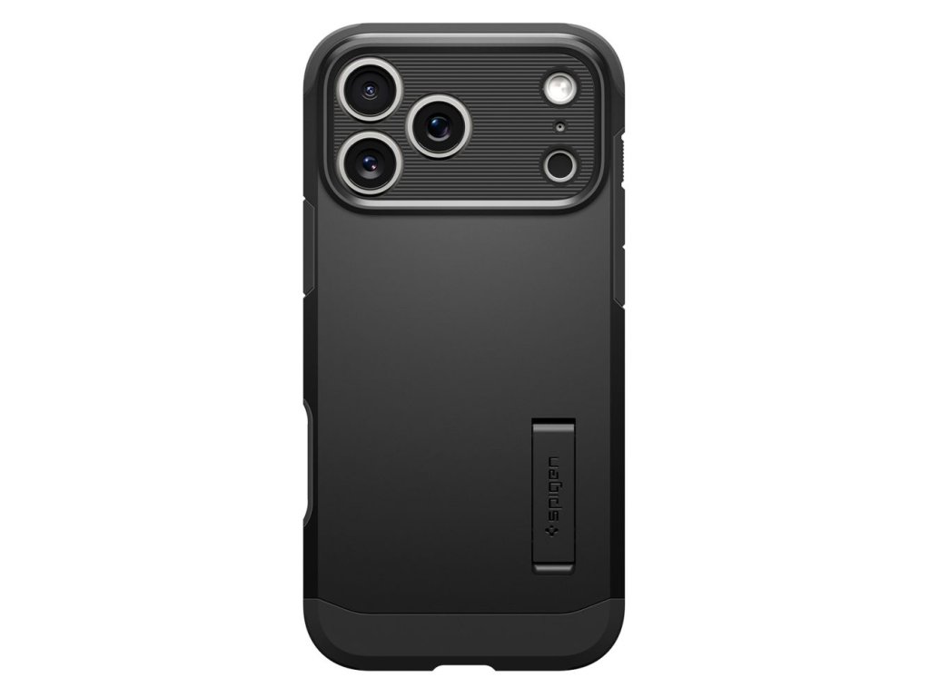 Pouzdro Spigen Tough Armor pro iPhone 17 Pro, vyrobené z TPU gelu a černého polykarbonátu, zabraňuje nechtěnému sklouznutí a je odolné proti opotřebení.