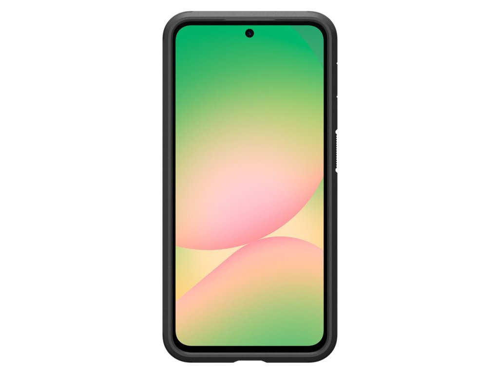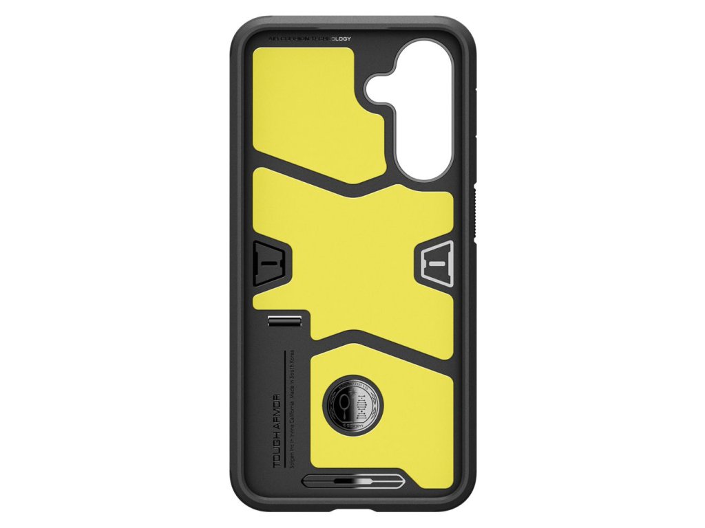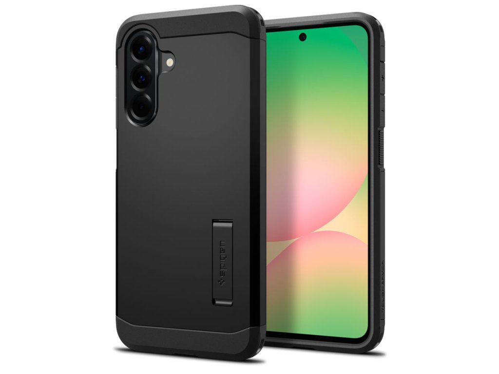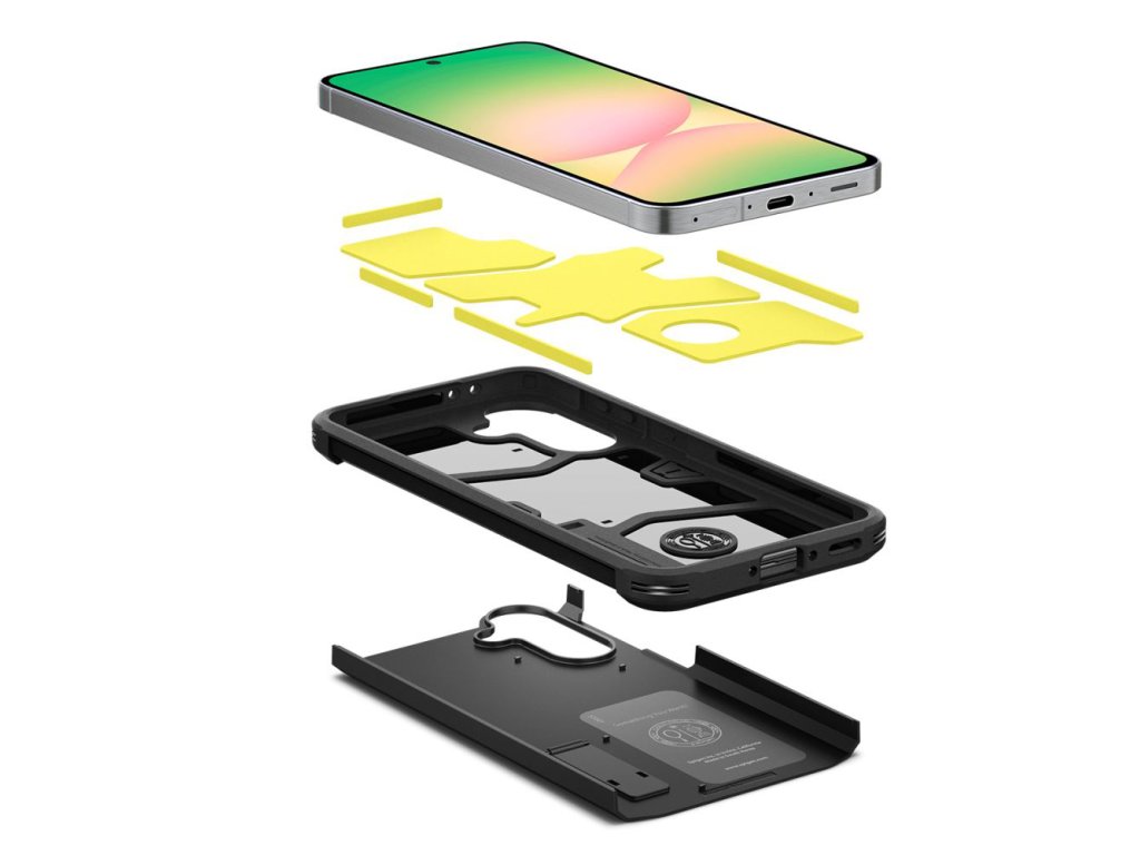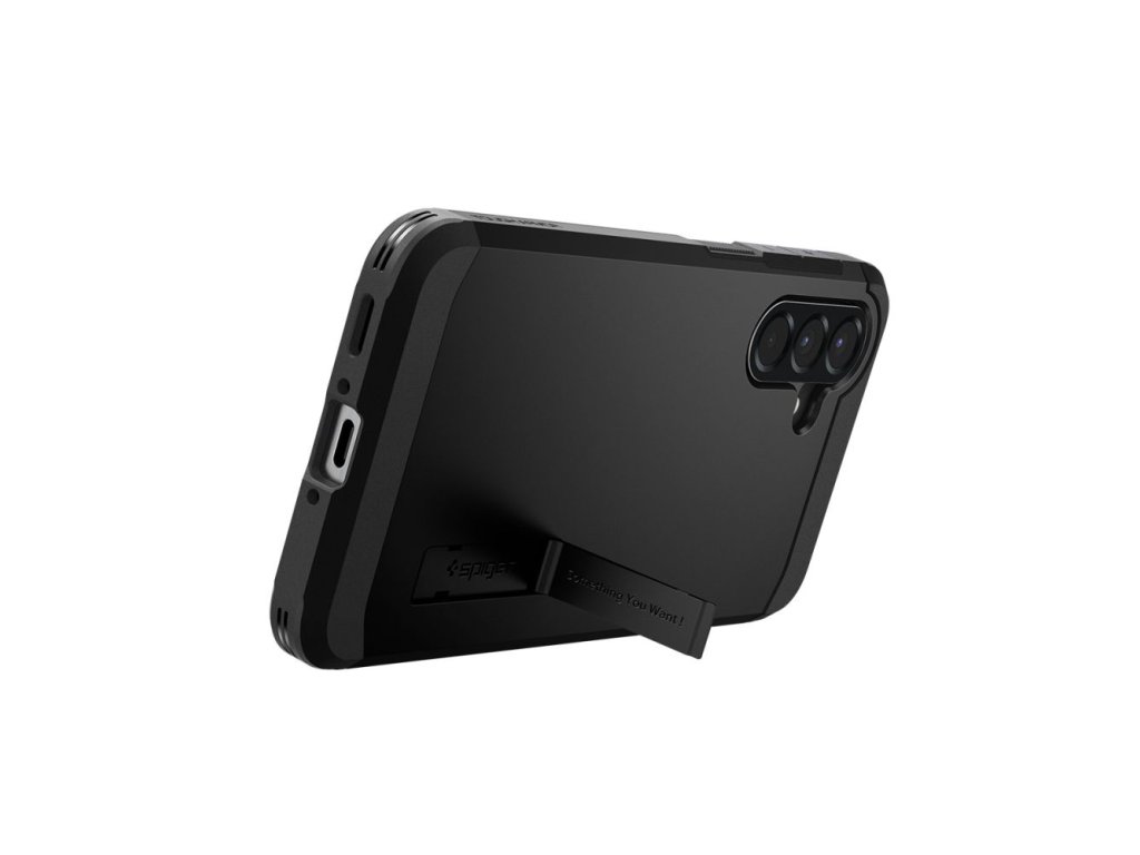 Pouzdro Spigen Tough Armor pro Samsung Galaxy A56 5G, vyrobené z TPU gelu a černého polykarbonátu, zabraňuje náhodnému sklouznutí a je odolné proti opotřebení.