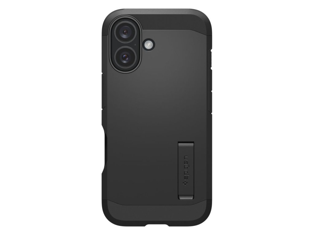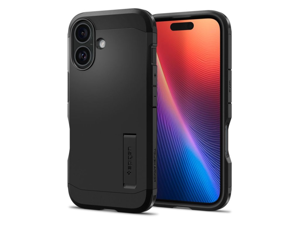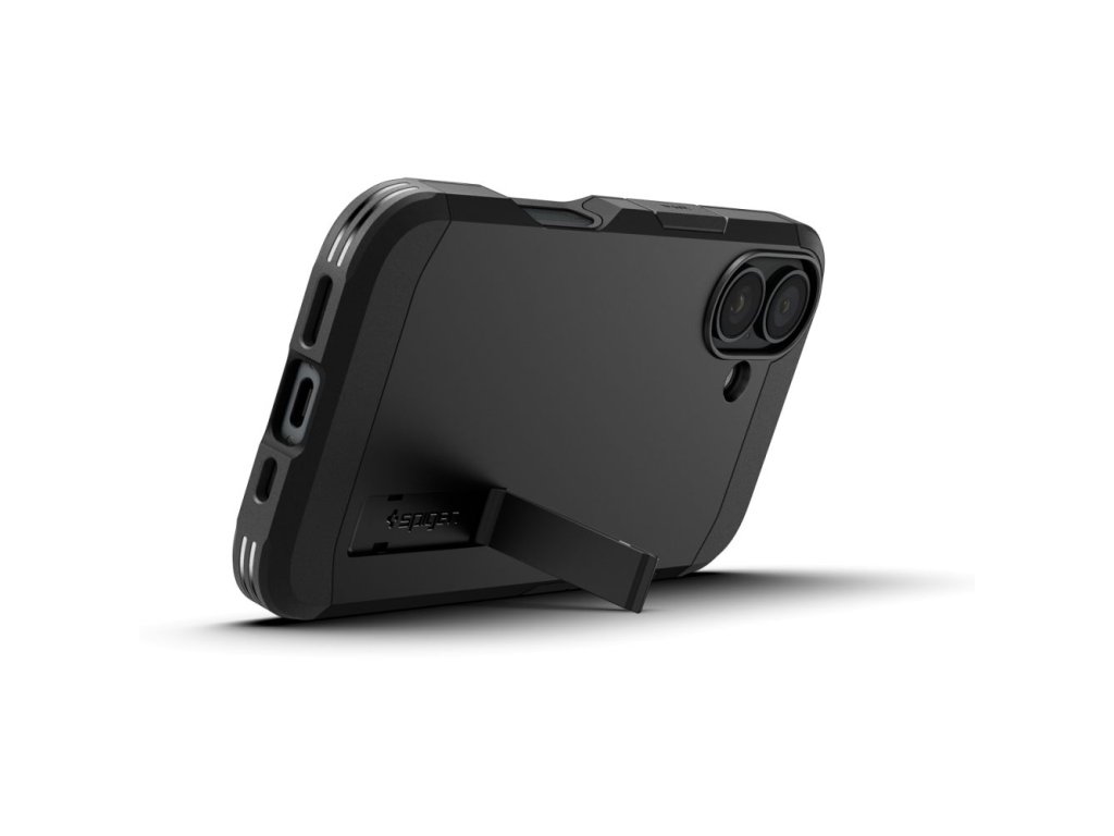 Kryt Spigen Tough Armor pro iPhone 16 Plus, vyrobený z černého TPU gelu a polykarbonátu, zabraňuje náhodnému sklouznutí a je odolný proti opotřebení.
