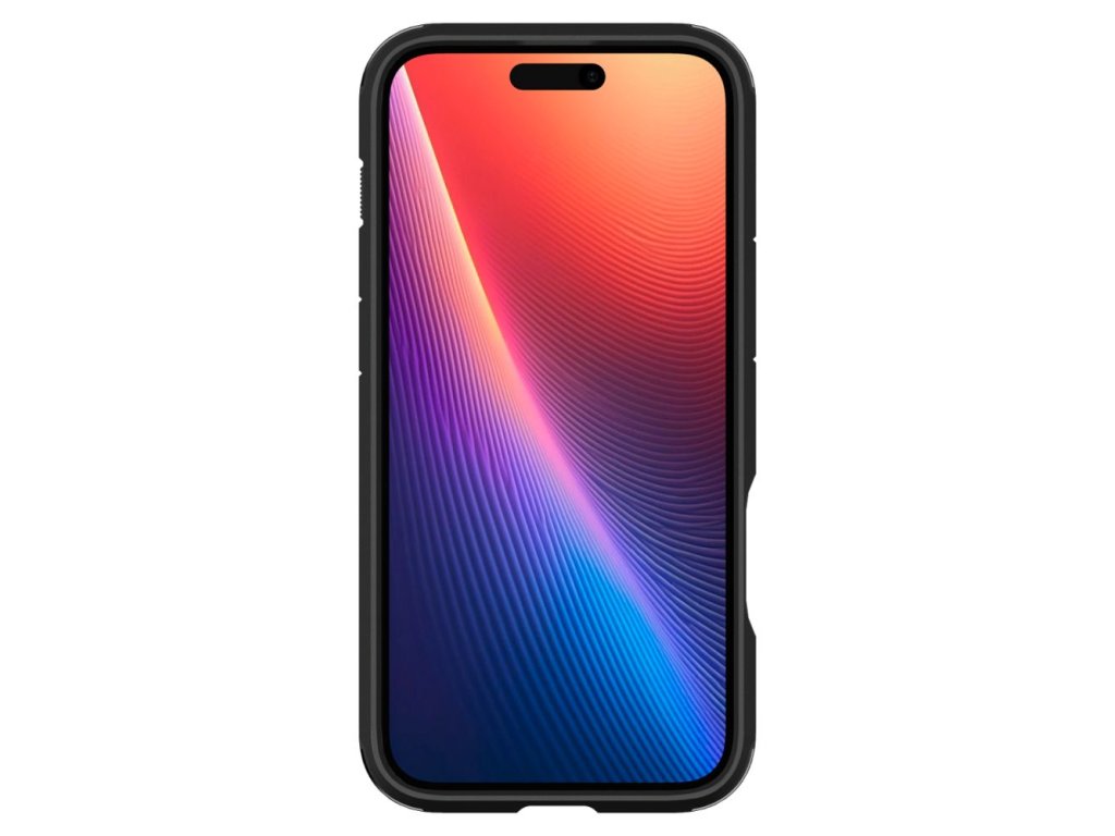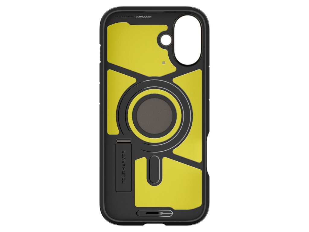 Obal Spigen Tough Armor pro iPhone 16, vyrobený z TPU gelu a černého polykarbonátu, zabraňuje náhodnému sklouznutí a je odolný vůči opotřebení.