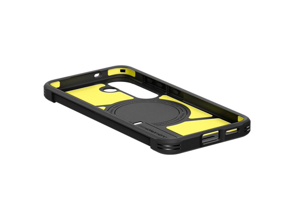 Kryt Spigen Tough Armor pro Samsung Galaxy S25, vyrobený z TPU gelu a černého polykarbonátu, zabraňuje nechtěnému sklouznutí a je odolný proti opotřebení.