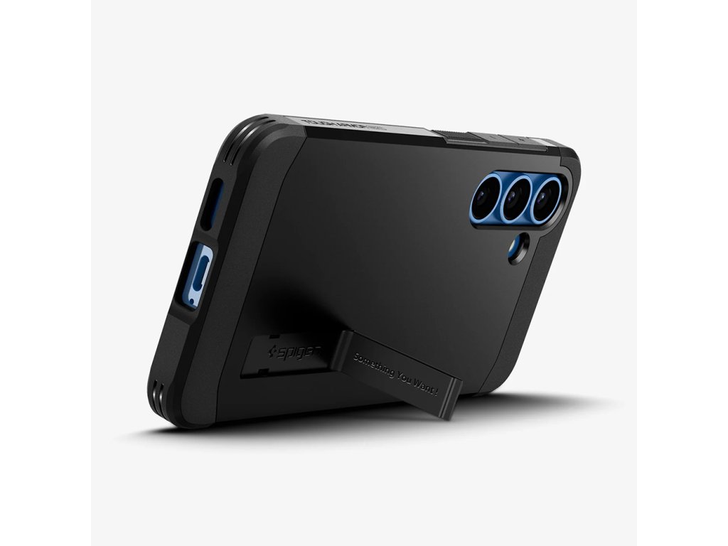 Obal Spigen Tough Armor pro Samsung Galaxy S25 Plus, vyrobený z TPU gelu a černého polykarbonátu, zabraňuje náhodnému sklouznutí a je odolný vůči opotřebení.