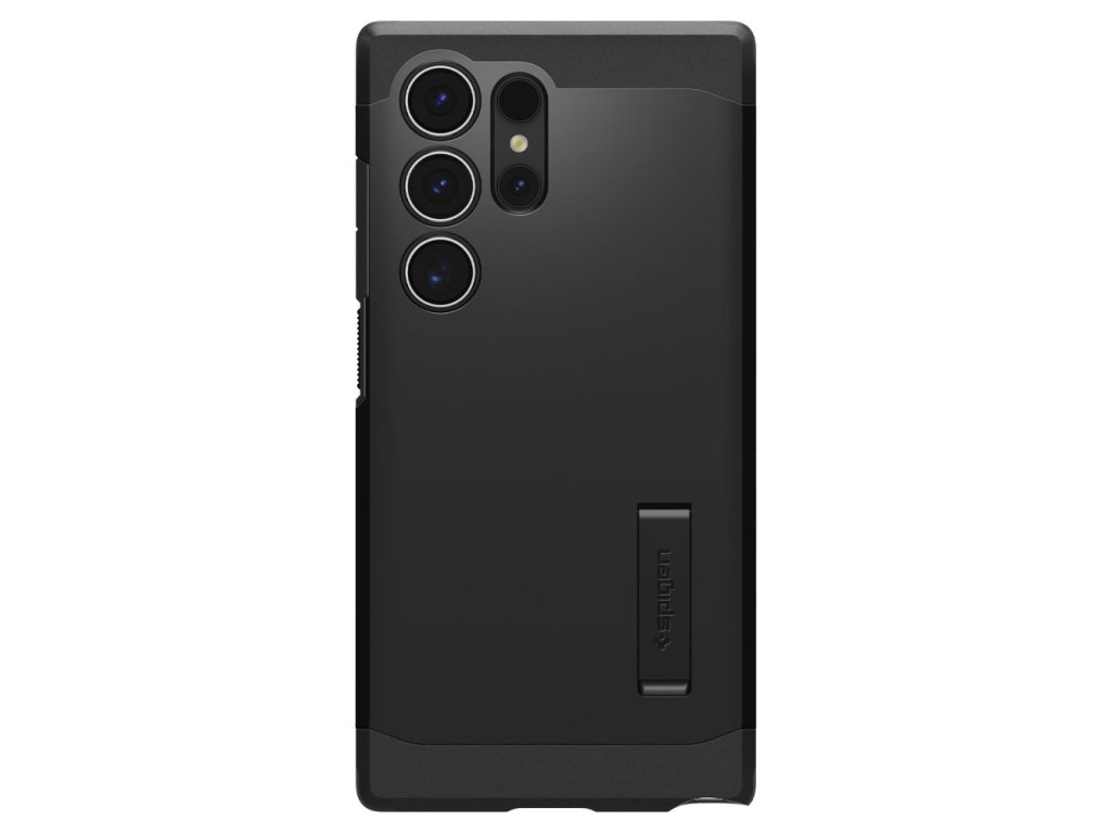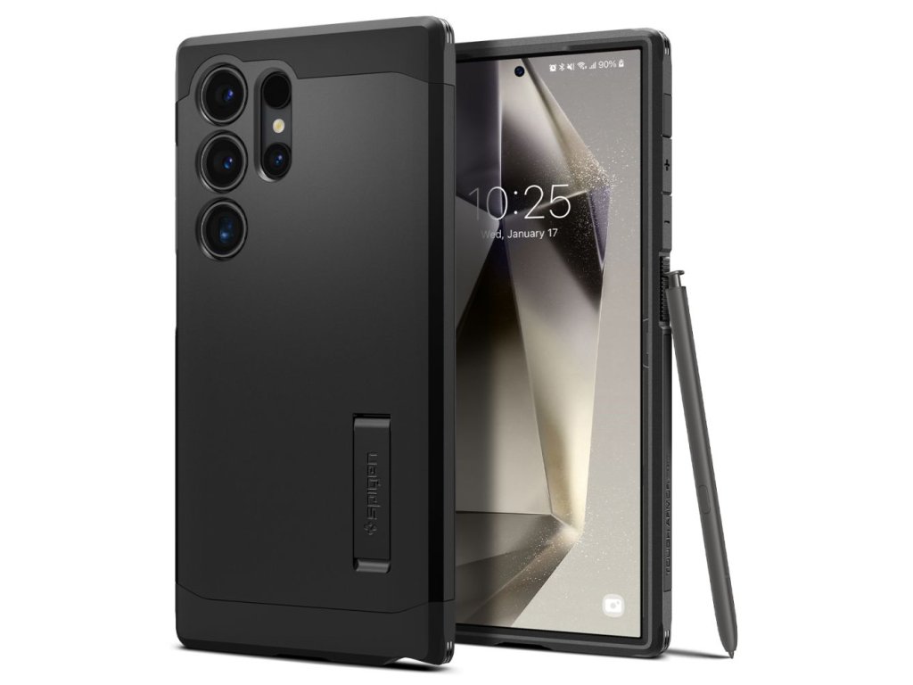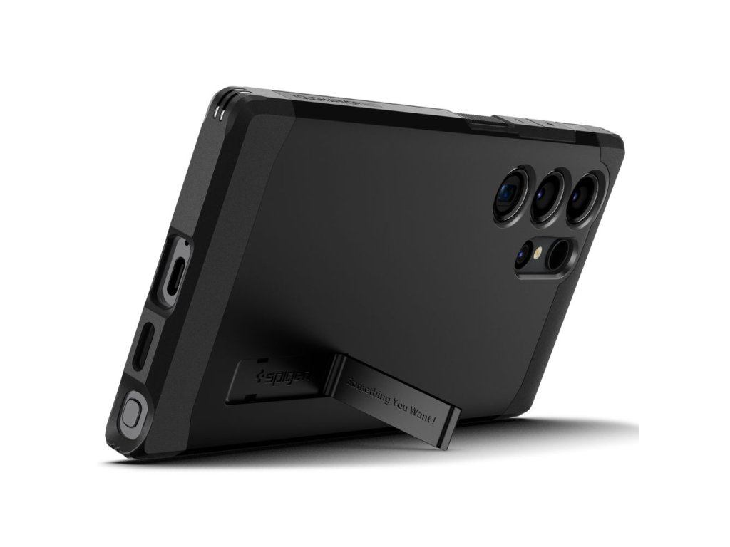 Pouzdro Spigen Tough Armor pro Samsung Galaxy S24 Ultra, vyrobené z gelu TPU a černého polykarbonátu, zabraňuje nechtěnému sklouznutí a je odolné proti opotřebení.