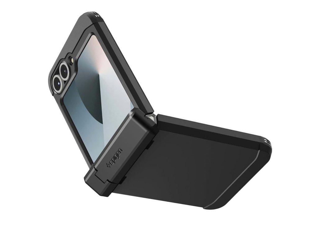Ochranný kryt Spigen Tough Armor pro Samsung Galaxy Z Flip6, vyrobený z TPU gelu a černého polykarbonátu, zabraňuje náhodnému sklouznutí díky odolnosti proti opotřebení.