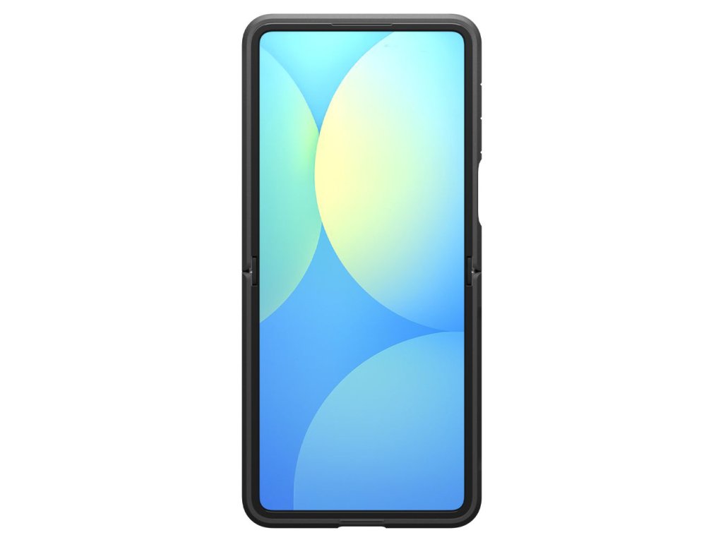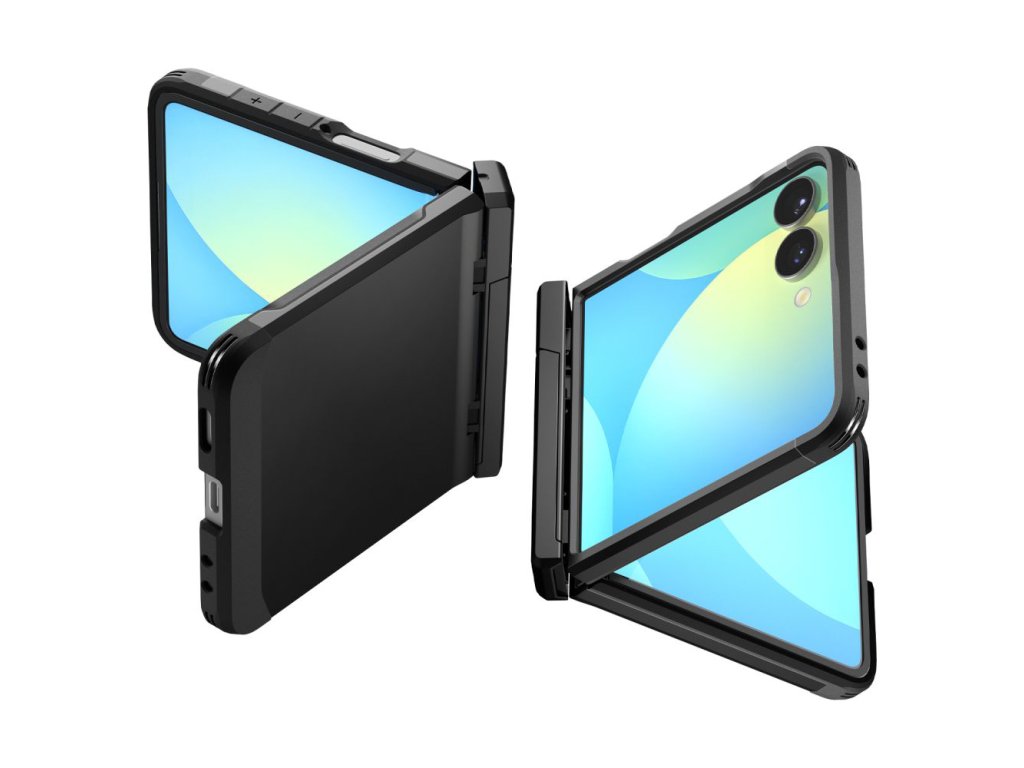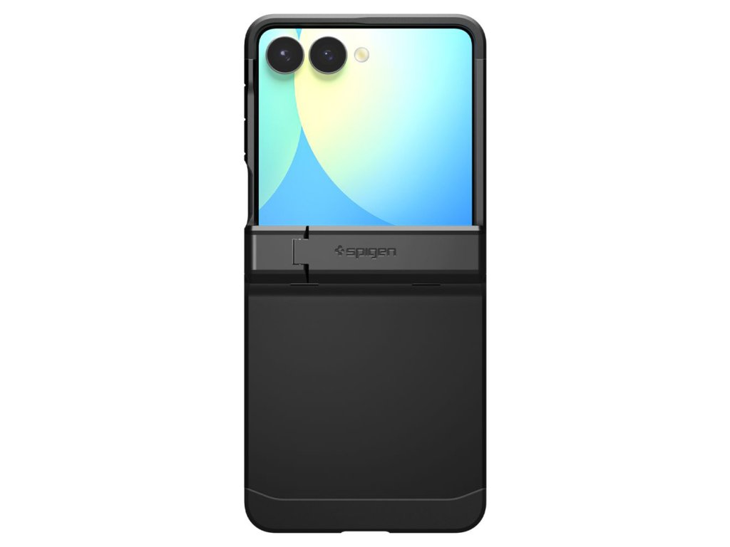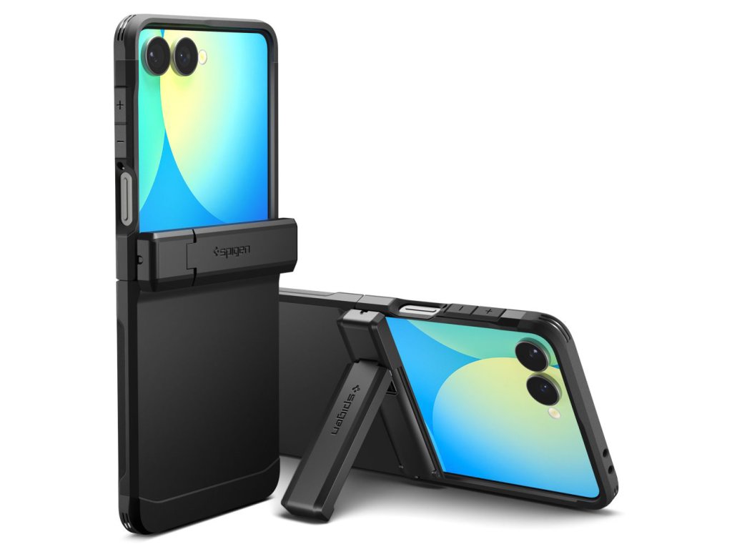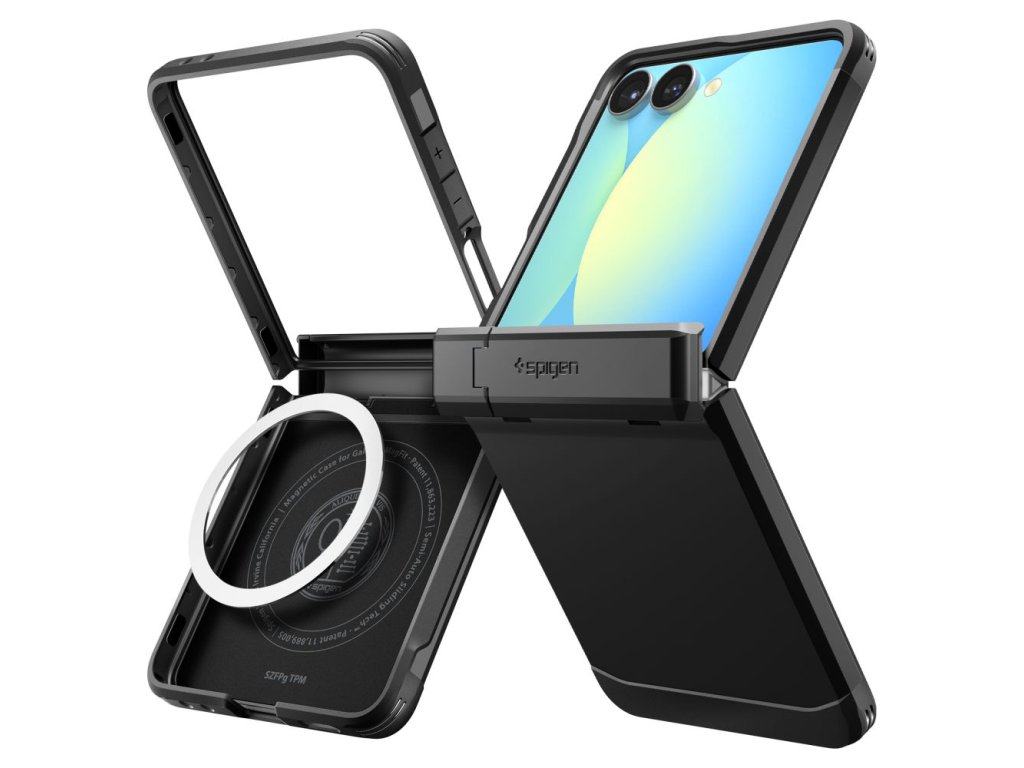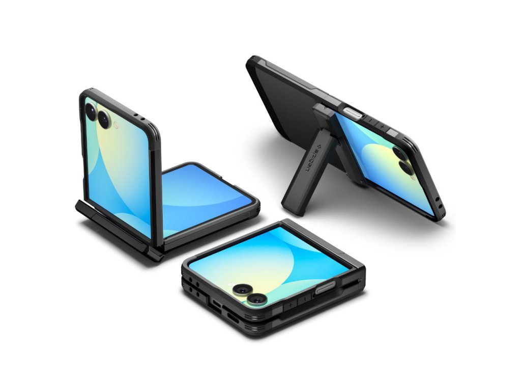 Obal Spigen Tough Armor pro Samsung Galaxy Z Flip7, vyrobený z TPU gelu a černého polykarbonátu, zabraňuje náhodnému sklouznutí a je odolný vůči opotřebení.