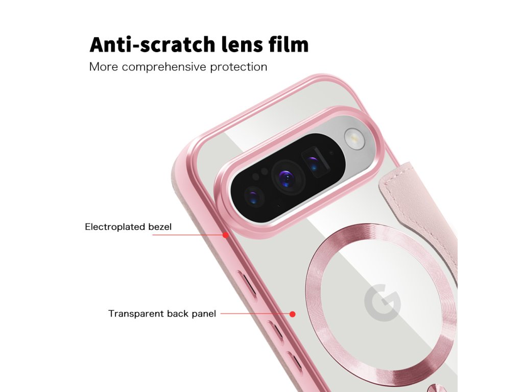 Zde je pouzdro pro Google Pixel 10 z ekologické kůže a TPU, s průhledným povrchem přerušeným lesklými akcenty.