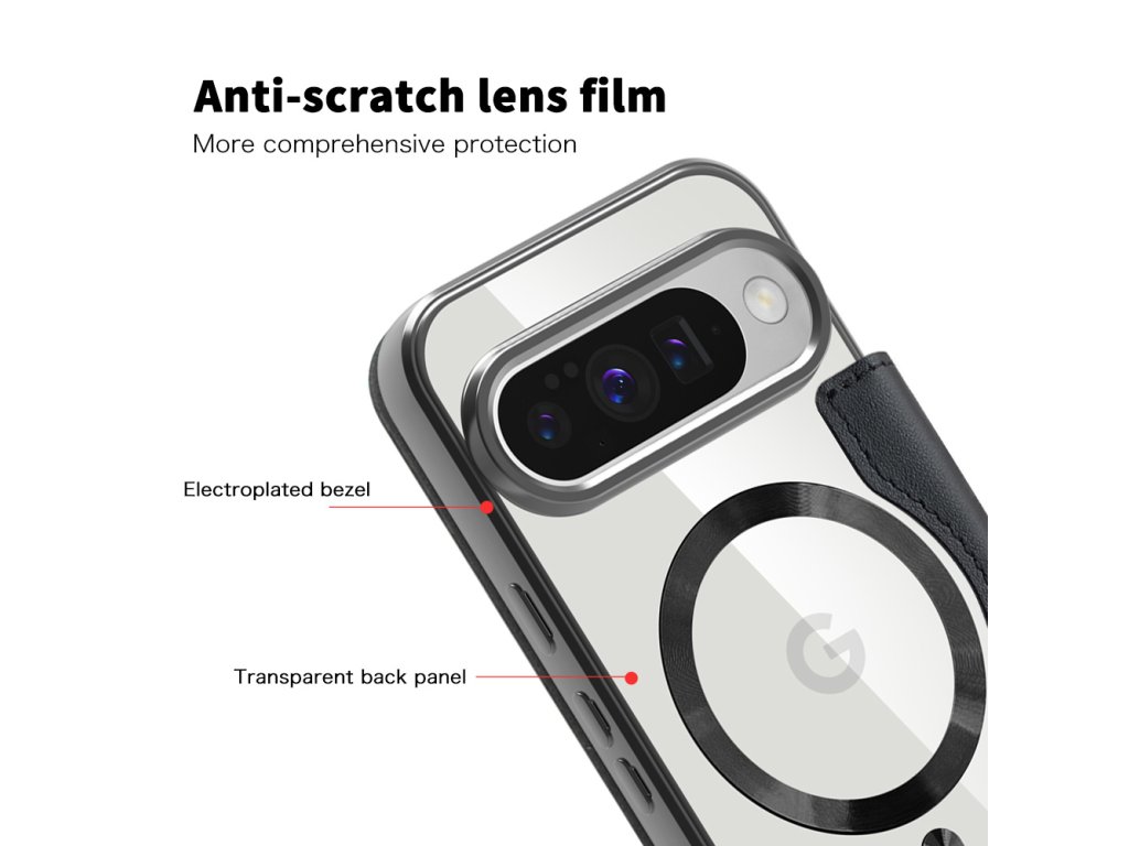 Zde je pouzdro pro Google Pixel 10 Pro XL z ekologické kůže a TPU, které má transparentní povrch přerušený lesklými akcenty.